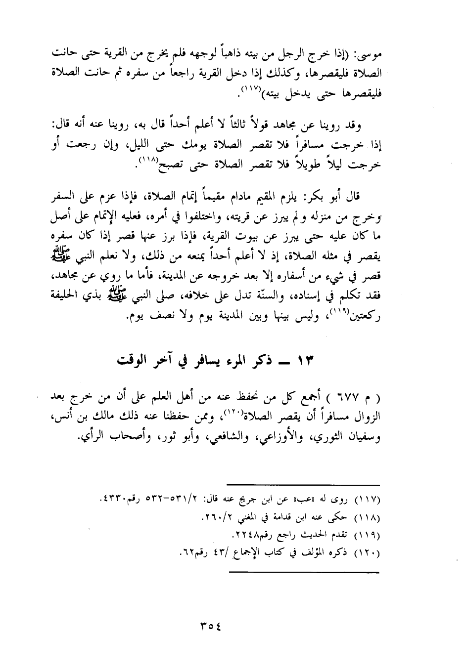 ذِكْرُ الْمَرْءِ يُسَافِرُ فِي آخِرِ الْوَقْتِ أَجْمَعَ كُلُّ مَنْ نَحْفَظُ عَنْهُ مِنْ أَهْلِ الْعِلْمِ عَلَى أَنَّ مَنْ خَرَجَ بَعْدَ الزَّوَالِ مُسَافِرًا أَنْ يَقْصُرَ الصَّلَاةَ، وَمِمَّنْ حَفِظْنَا عَنْهُ ذَلِكَ مَالِكُ بْنُ أَنَسٍ، وَسُفْيَانُ الثَّوْرِيُّ، وَالْأَوْزَاعِيُّ، وَالشَّافِعِيُّ، وَأَبُو ثَوْرٍ، وَأَصْحَابُ الرَّأْيِ