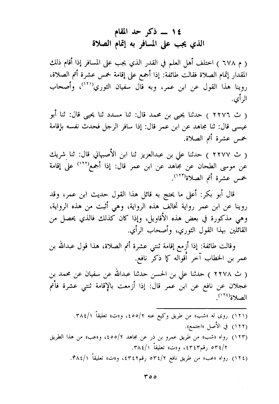 2277 - حَدَّثَنَا عَلِيُّ بْنُ عَبْدِ الْعَزِيزِ، ثنا ابْنُ الْأَصْبَهَانِيِّ: قَالَ: ثنا شَرِيكٌ، عَنْ مُوسَى الطَّحَّانِ، عَنْ مُجَاهِدٍ، عَنِ ابْنُ عُمَرَ: «إِذَا أَجْمَعَ عَلَى إِقَامَةِ خَمْسَ عَشْرَةَ أَتَمَّ الصَّلَاةَ» قَالَ أَبُو بَكْرٍ: أَعْلَى مَا يَحْتَجُّ بِهِ قَائِلٌ هَذَا الْقَوْلُ حَدِيثُ ابْنِ عُمَرَ، وَقَدْ رُوِّينَا عَنِ ابْنِ عُمَرَ رِوَايَةً تُخَالِفُ هَذِهِ الرِّوَايَةَ، وَهِيَ أَثْبَتُ مِنْ هَذِهِ الرِّوَايَةِ، وَهِيَ مَذْكُورَةٌ فِي بَعْضِ هَذِهِ الْأَقَاوِيلِ، وَإِذَا كَانَ كَذَلِكَ فَالَّذِي يَحْصُلُ مِنَ الْقَائِلِينَ بِهَذَا الْقَوْلِ، الثَّوْرِيُّ، وَأَصْحَابُ الرَّأْيِ. وَقَالَتْ طَائِفَةٌ: إِذَا أَزْمَعَ إِقَامَةَ ثِنْتَيْ عَشْرَةَ أَتَمَّ الصَّلَاةَ، هَذَا قَوْلُ عَبْدِ اللهِ بْنِ عُمَرَ بْنِ الْخَطَّابِ، آخِرُ أَقْوَالِهِ كَمَا ذَكَرَ نَافِعٌ