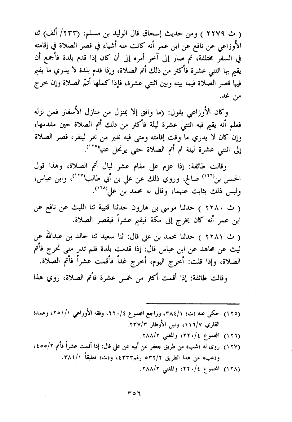 2279 - وَمِنْ حَدِيثِ إِسْحَاقَ، قَالَ الْوَلِيدُ بْنُ مُسْلِمٍ: ثنا الْأَوْزَاعِيُّ، عَنْ نَافِعٍ، عَنِ ابْنِ عُمَرَ: «أَنَّهُ كَانَتْ مِنْهُ أَشْيَاءَ فِي قَصْرِ الصَّلَاةِ فِي إِقَامَتِهِ فِي السَّفَرِ مُخْتَلِفَةً، ثُمَّ صَارَ إِلَى آخِرِ أَمْرِهِ إِلَى أَنْ كَانَ إِذَا قَدِمَ بَلْدَةً فَأَجْمَعَ أَنْ يُقِيمَ بِهَا اثْنَتَيْ عَشْرَةَ فَأَكْثَرَ مِنْ ذَلِكَ أَتَمَّ الصَّلَاةَ، وَإِذَا قَدِمَ بَلْدَةً لَا يَدْرِي مَا يُقِيمُ فِيهَا قَصَرَ الصَّلَاةَ فِيمَا بَيْنَهُ وَبَيْنَ اثْنَتَيْ عَشْرَةَ، فَإِذَا كَمَّلَهَا أَتَمَّ الصَّلَاةَ، وَإِنْ خَرَجَ مِنْ غَدٍ» وَكَانَ الْأَوْزَاعِيُّ يَقُولُ: مَا وَافَقَ إِلَّا بِمَنْزِلٍ مِنْ مَنَازِلِ الْأَسْفَارِ، فَمَنْ نَزَلَهُ فَعَلِمَ أَنَّهُ يُقِيمُ فِيهِ اثْنَتَيْ عَشْرَةَ لَيْلَةً فَأَكْثَرَ مِنْ ذَلِكَ أَتَمَّ الصَّلَاةَ حِينَ مَقْدِمِهَا، وَإِنْ كَانَ لَا يَدْرِي مَا وَقْتُ إِقَامَتِهِ، وَمَتَى فِيهِ نُفَيْرُ مَنْ نَفَرَ لِيَنْفِرَ، قَصَرَ الصَّلَاةَ إِلَى اثْنَتَيْ عَشْرَةَ لَيْلَةً، ثُمَّ أَتَمَّ الصَّلَاةَ حَتَّى يَرْتَحِلَ عَنْهَا. وَقَالَتْ طَائِفَةٌ: إِذَا عَزَمَ عَلَى مُقَامِ عَشْرِ لَيَالٍ أَتَمَّ الصَّلَاةَ، وَهَذَا قَوْلُ الْحَسَنِ بْنِ صَالِحٍ، وَرُوِيَ ذَلِكَ عَنْ عَلِيِّ بْنِ أَبِي طَالِبٍ، وَابْنِ عَبَّاسٍ، وَلَيْسَ ذَلِكَ بِثَابِتٍ عَنْهُمَا، وَقَالَ بِهِ مُحَمَّدُ بْنُ عَلِيٍّ