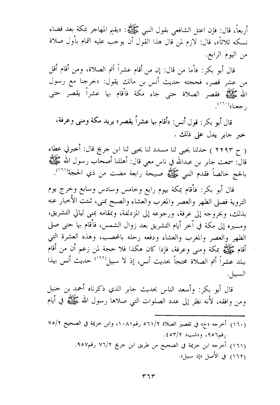 2293 - حَدَّثَنَا يَحْيَى، ثنا مُسَدَّدٌ ثَنَا يَحْيَى، ثنا ابْنُ جُرَيْجٍ، قَالَ: أَخْبَرَنِي عَطَاءٌ، قَالَ: سَمِعْتُ جَابِرَ بْنَ عَبْدِ اللهِ، فِي نَاسٍ مَعِيَ، قَالَ: «أَهْلَلْنَا أَصْحَابَ رَسُولِ اللهِ صَلَّى اللَّهُ عَلَيْهِ وَسَلَّمَ بِالْحَجِّ خَالِصًا فَقَدِمَ النَّبِيُّ صَلَّى اللَّهُ عَلَيْهِ وَسَلَّمَ صَبِيحَةَ رَابِعَةٍ مَضَتْ مِنْ ذِي الْحِجَّةِ» قَالَ أَبُو بَكْرٍ: فَأَقَامَ بِمَكَّةَ بِيَوْمٍ رَابِعٍ وَخَامِسٍ وَسَادِسٍ وَسَابِعٍ، وَخَرَجَ يَوْمَ التَّرْوِيَةِ فَصَلَّى الظُّهْرَ وَالْعَصْرَ وَالْمَغْرِبَ وَالْعِشَاءَ وَالصُّبْحَ بِمِنًى، ثَبَتَتِ الْأَخْبَارُ عَنْهُ بِذَلِكَ، وَبِخُرُوجِهِ إِلَى عَرَفَةَ، وَرُجُوعِهِ إِلَى الْمُزْدَلِفَةِ، وَبِمُقَامِهِ بِمِنًى لَيَالِيَ التَّشْرِيقِ، وَمَسِيرَهِ إِلَى مَكَّةَ فِي آخِرِ أَيَّامِ التَّشْرِيقِ بَعْدَ زَوَالِ الشَّمْسِ، فَأَقَامَ بِهَا حَتَّى صَلَّى الظُّهْرَ وَالْعَصْرَ وَالْمَغْرِبَ وَالْعِشَاءَ وَدَفَعَهُ رَحْلُهُ بِالْمُحَصَّبِ، وَهَذِهِ الْعَشَرَةُ الَّتِي أَقَامَ صَلَّى اللَّهُ عَلَيْهِ وَسَلَّمَ بِمَكَّةَ وَمِنًى وَعَرَفَةَ، فَإِذَا كَانَ هَكَذَا فَلَا حَجَّةَ لِمَنْ زَعَمَ أَنَّ مَنَ أَقَامَ بِبَلَدٍ عَشْرًا أَتَمَّ الصَّلَاةَ مُحْتَجًّا بِحَدِيثِ أَنَسٍ، إِذْ لَا سَبِيلَ، حَدِيثُ أَنَسٍ بِهَذَا السَّبِيلِ. قَالَ أَبُو بَكْرٍ: وَأَسْعَدُ النَّاسِ بِحَدِيثِ جَابِرٍ الَّذِي ذَكَرْنَاهُ أَحْمَدُ بْنُ حَنْبَلٍ وَمَنْ وَافَقَهُ، لِأَنَّهُ نَظَرَ إِلَى عَدَدِ الصَّلَوَاتِ الَّتِي صَلَّاهَا رَسُولُ اللهِ صَلَّى اللَّهُ عَلَيْهِ وَسَلَّمَ فِي أَيَّامِ -[364]- مُقَامِهِ بِمَكَّةَ فِي حَجَّتِهِ، فَأَجَازَ أَنْ يَقْصُرَ مَنْ أَقَامَ مِقْدَارَ يُصَلِّي ذَلِكَ الْعَدَدِ مِنَ الصَّلَوَاتِ، وَأَمَرَ مَنْ زَادِ مُقَامُهُ عَلَى ذَلِكَ الْمِقْدَارِ بِالْإِتْمَامِ، وَهَذَا الْقَوْلُ أَوْلَى مَنِ اتَّبَعَ فِعْلَ رَسُولِ اللهِ صَلَّى اللَّهُ عَلَيْهِ وَسَلَّمَ وَقَعَدَ الْآخِذُ بِحَدِيثِ جَابِرٍ فِي هَذَا الْبَابِ مِنْ قَوْلِ غَيْرِهِ