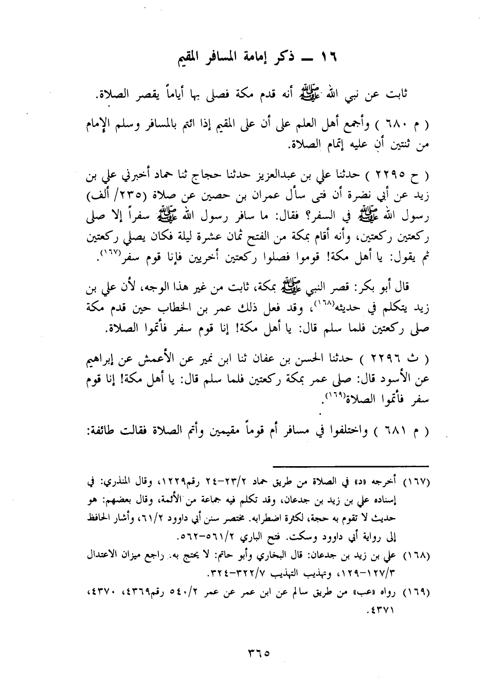 2295 - حَدَّثَنَا عَلِيُّ بْنُ عَبْدِ الْعَزِيزِ، حَدَّثَنَا حَجَّاجٌ، ثنا حَمَّادٌ، أَخْبَرَنِي عَلِيُّ بْنُ زَيْدٍ، عَنْ أَبِي نَضْرَةَ: " أَنَّ فَتًى، سَأَلَ عِمْرَانَ بْنَ حُصَيْنٍ عَنْ صَلَاةِ، رَسُولِ اللهِ صَلَّى اللَّهُ عَلَيْهِ وَسَلَّمَ فِي السَّفَرِ؟، فَقَالَ: مَا سَافَرَ رَسُولُ اللهِ صَلَّى اللَّهُ عَلَيْهِ وَسَلَّمَ سَفَرًا إِلَّا صَلَّى رَكْعَتَيْنِ رَكْعَتَيْنِ، وَأَنَّهُ أَقَامَ بِمَكَّةَ مِنَ الْفَتْحِ ثَمَانِ عَشْرَةَ لَيْلَةً فَكَانَ يُصَلِّي رَكْعَتَيْنِ ثُمَّ يَقُولُ: «يَا أَهْلَ مَكَّةَ، قُومُوا فَصَلُّوا رَكْعَتَيْنِ أُخْرَيَيْنِ فَإِنَّا قَوْمٌ سَفْرٌ» قَالَ أَبُو بَكْرٍ: قَصْرُ النَّبِيِّ صَلَّى اللَّهُ عَلَيْهِ وَسَلَّمَ بِمَكَّةَ ثَابِتٌ مِنْ غَيْرِ هَذَا الْوَجْهِ، لِأَنَّ عَلِيَّ بْنَ زَيْدٍ يَتَكَلَّمُ فِي حَدِيثِهِ، وَقَدْ فَعَلَ ذَلِكَ عُمَرُ بْنُ الْخَطَّابِ حِينَ قَدِمَ مَكَّةَ، صَلَّى رَكْعَتَيْنِ فَلَمَّا سَلَّمَ قَالَ: يَا أَهْلَ مَكَّةَ، إِنَّا قَوْمٌ سَفْرٌ فَأَتِمُّوا الصَّلَاةَ
