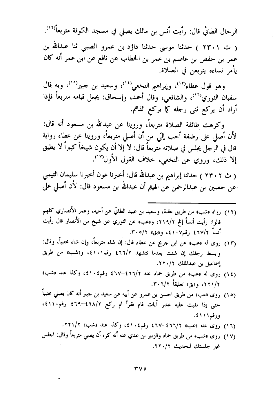 2301 - حَدَّثَنَا مُوسَى، حَدَّثَنَا دَاوُدُ بْنُ عَمْرٍو الضَّبِّيُّ، ثنا عَبْدُ اللهِ بْنُ عُمَرَ بْنِ حَفْصِ بْنِ عَاصِمِ بْنِ عُمَرَ بْنِ الْخَطَّابِ، عَنْ نَافِعٍ، عَنِ ابْنِ عُمَرَ: «أَنَّهُ كَانَ يَأْمُرُ نِسَاءَهُ يَتَرَبَّعْنَ فِي الصَّلَاةِ» وَهُوَ قَوْلُ عَطَاءٍ، وَإِبْرَاهِيمَ النَّخَعِيِّ، وَسَعِيدِ بْنِ جُبَيْرٍ، وَبِهِ قَالَ سُفْيَانُ الثَّوْرِيُّ، وَالشَّافِعِيُّ وَقَالَ أَحْمَدُ، وَإِسْحَاقُ: يَجْعَلُ قِيَامَهُ مُتَرَبِّعًا فَإِذَا أَرَادَ أَنْ يَرْكَعَ ثَنَى رِجْلَهُ كَمَا يَرْكَعُ الْقَائِمُ. وَكَرِهَتْ طَائِفَةٌ الصَّلَاةَ مُتَرَبِّعًا، وَرُوِّينَا عَنْ عَبْدِ اللهِ بْنِ مَسْعُودٍ أَنَّهُ قَالَ: لَأَنْ أُصَلِّيَ عَلَى رُضْفَةٍ أَحَبُّ إِلَيَّ مِنْ أَنْ أُصَلِّيَ مُتَرَبِّعًا، وَرُوِّينَا عَنْ عَطَاءٍ رِوَايَةً، قَالَ: فِي الرَّجُلِ يَجْلِسُ فِي صَلَاتِهِ مُتَرَبِّعًا، قَالَ: لَا، إِلَّا أَنْ يَكُونَ شَيْخًا كَبِيرًا لَا يُطِيقُ إِلَّا ذَلِكَ، وَرُوِيَ عَنِ النَّخَعِيِّ خِلَافُ الْقَوْلِ الْأَوَّلِ