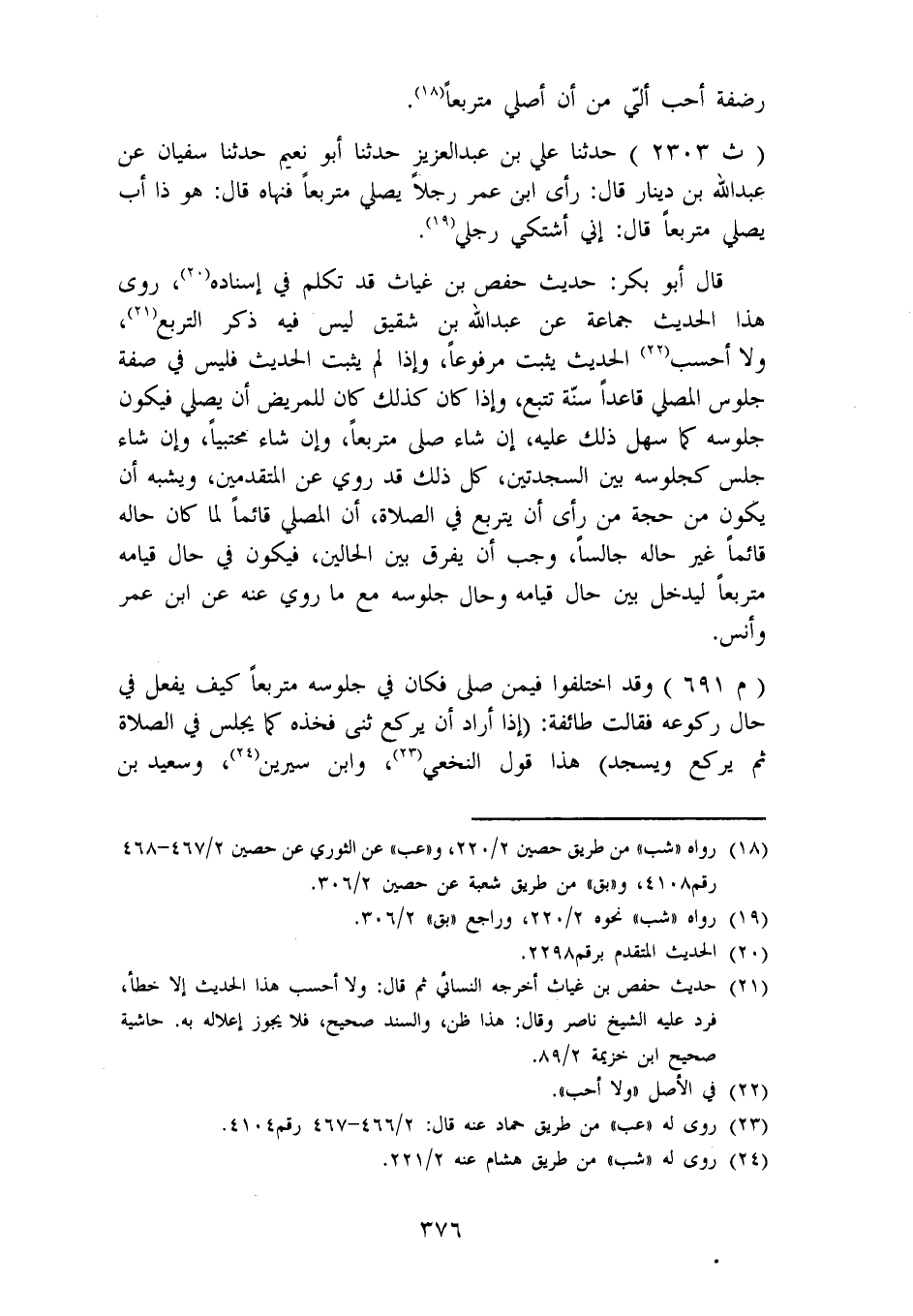 2303 - حَدَّثَنَا عَلِيُّ بْنُ عَبْدِ الْعَزِيزِ، حَدَّثَنَا أَبُو نُعَيْمٍ، حَدَّثَنَا سُفْيَانُ، عَنْ عَبْدِ اللهِ بْنِ دِينَارٍ، قَالَ: " رَأَى ابْنُ عُمَرَ رَجُلًا يُصَلِّي مُتَرَبِّعًا فَنَهَاهُ، قَالَ: هُوَ ذَا أَبٌ يُصَلِّي مُتَرَبِّعًا، قَالَ: إِنِّي أَشْتَكِي رِجْلَيَّ " قَالَ أَبُو بَكْرٍ: حَدِيثُ حَفْصِ بْنِ غِيَاثٍ قَدْ تُكُلِّمَ فِي إِسْنَادِهِ، رَوَى هَذَا الْحَدِيثَ جَمَاعَةٌ عَنْ عَبْدِ اللهِ بْنِ شَقِيقٍ لَيْسَ فِيهِ ذِكْرُ التَّرَبُّعِ، وَلَا أَحْسَبُ الْحَدِيثَ يَثْبُتُ مَرْفُوعًا، وَإِذَا لَمْ يَثْبُتِ الْحَدِيثُ فَلَيْسَ فِي صِفَةِ جُلُوسِ الْمُصَّلي قَاعِدًا سُنَّةٌ تُتَّبَعُ، وَإِذَا كَانَ كَذَلِكَ كَانَ لِلْمَرِيضِ أَنْ يُصَلِّيَ فَيَكُونَ جُلُوسُهُ كَمَا سَهُلَ ذَلِكَ عَلَيْهِ، إِنْ شَاءَ صَلَّى مُتَرَبِّعًا، وَإِنْ شَاءَ مُحْتَبِيًا، وَإِنْ شَاءَ جَلَسَ كَجُلُوسِهِ بَيْنَ السَّجْدَتَيْنِ، كُلُّ ذَلِكَ قَدْ رُوِيَ عَنِ الْمُتَقَدِّمِينَ، وَيُشْبِهُ أَنْ يَكُونَ مِنْ حُجَّةِ مَنْ رَأَى أَنْ يَتَرَبَّعَ فِي الصَّلَاةِ أَنَّ الْمُصَلِّيَ قَائِمًا لَمَّا كَانَ حَالُهُ قَائِمًا غَيْرَ حَالِهِ جَالِسًا، وَجَبَ أَنْ يُفَرِّقَ بَيْنَ الْحَالَتَيْنِ، فَيَكُونُ فِي الْحَالِ قِيَامُهُ مُتَرَبِّعًا لِيَدْخُلَ بَيْنَ حَالِ قِيَامِهِ وَحَالِ جُلُوسِهِ مَعَ مَا رُوِيَ عَنْهُ عَنِ ابْنِ عُمَرَ وَأَنَسٍ. وَقَدِ اخْتَلَفُوا فِيمَنْ صَلَّى فَكَانَ فِي جُلُوسُهُ مُتَرَبِّعًا كَيْفَ يَفْعَلُ فِي حَالِ رُكُوعِهِ؟، فَقَالَتْ طَائِفَةٌ: إِذَا أَرَادَ أَنْ يَرْكَعَ ثَنَى فَخِذَهُ كَمَا يَجْلِسُ فِي الصَّلَاةِ، ثُمَّ يَرْكَعُ وَيَسْجُدُ، هَذَا قَوْلُ النَّخَعِيِّ، وَابْنِ سِيرِينَ، وَسَعِيدِ بْنِ -[377]- جُبَيْرٍ، وَمُجَاهِدٍ، وَسَالِمِ بْنِ عَبْدِ اللهِ بْنِ عُمَرَ، وَبِهِ قَالَ أَحْمَدُ، وَإِسْحَاقُ. وَقَالَتْ طَائِفَةٌ: يَكُونُ جُلُوسُهُ مُتَرَبِّعًا، وَيَرْكَعُ وَهُوَ مُتَرَبِّعٌ، فَإِذَا أَرَادَ أَنْ يَسْجُدَ ثَنَى رِجْلَهُ، هَذَا قَوْلُ سُفْيَانَ الثَّوْرِيِّ، وَحُكِيَ عَنْ مَالِكٍ نَحْوٌ مِنْ قَوْلِ الثَّوْرِيِّ، وَقَدْ رُوِّينَا عَنِ ابْنِ الْمُسَيِّبِ أَنَّهُ قَالَ: إِذَا أَرَادَ أَنْ يَسْجُدَ ثَنَى رِجْلَهُ وَسَجَدَ
