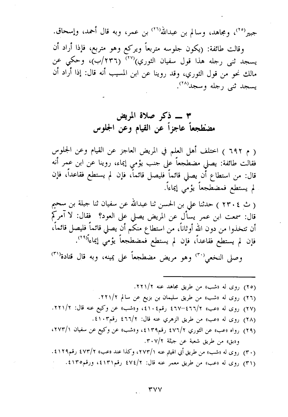 2304 - حَدَّثَنَا عَلِيُّ بْنُ الْحَسَنِ، ثنا عَبْدُ اللهِ، عَنْ سُفْيَانَ، ثنا جَبَلَةُ بْنُ سُحَيْمٍ، قَالَ: سَمِعْتُ ابْنَ عُمَرَ: " يَسْأَلُ عَنِ الْمَرِيضِ، يُصَلِّي عَلَى الْعُودِ؟، فَقَالَ: لَا آمُرُكُمْ أَنْ تَتَّحِذُوا مِنْ دُونِ اللهِ أَوْثَانًا، مَنِ اسْتَطَاعَ مِنْكُمْ أَنْ يُصَلِّيَ قَائِمًا فَلْيُصَلِّ قَائِمًا فَإِنْ لَمْ يَسْتَطِعْ فَقَاعِدًا، فَإِنْ لَمْ يَسْتَطِعْ فَمُضْطَجِعًا يُومِي إِيمَاءً " وَصَلَّى النَّخَعِيُّ وَهُوَ مَرِيضٌ مُضْطَجِعًا عَلَى يَمِينِهِ، وَبِهِ قَالَ قَتَادَةُ. -[378]- وَقَالَ عَطَاءٌ: يُصَلَّى مُضْطَجِعًا فَإِنْ لَمْ يَسْتَطِعْ فَلْيُصَلِّ مُسْتَلْقِيًا يُومِي بِرَأْسِهِ، وَمِمَّنْ رَأَى أَنْ يُصَلِّيَ مُضْطَجِعًا إِذَا عَجَزَ عَنِ الْجُلُوسِ سُفْيَانُ الثَّوْرِيُّ، وَالشَّافِعِيُّ، وَقَالَ أَحْمَدُ، وَإِسْحَاقُ: يُصَلِّي عَلَى مَا قُدَرَ وَتَيَسَّرَ عَلَيْهِ، وَقَالَ أَصْحَابُ الرَّأْيِ فِي الْمَرِيضِ الَّذِي لَا يَسْتَطِيعُ أَنْ يُصَلِّيَ إِلَّا مُضْطَجِعًا: يَسْتَقْبِلُ الْقِبْلَةَ، ثُمَّ يُصَلِّي مُضْطَجِعًا يُومِي إِيمَاءً، السُّجُودُ أَخْفَضُ مِنَ الرُّكُوعِ. وَقَالَتْ طَائِفَةٌ: فِي الْمَرِيضِ إِذَا لَمْ يَسْتَطِعْ أَنْ يُصَلِّيَ قَاعِدًا يُصَلِّي مُسْتَلْقِيًا، وَيَجْعَلَ رِجْلَيْهِ مِمَّا يَلِي الْقِبْلَةَ وَيُومِي بِرَأْسِهِ إِيمَاءً، هَذَا قَوْلُ الْحَارِثِ الْعُكْلِيِّ، وَحُكِيَ عَنِ الثَّوْرِيِّ كَقَوْلِ الْحَارِثِ الْفَارَيَابِيُّ عَنْهُ، وَالْحِكَايَةُ الْأُولَى ذَكَرَهَا الْأَشْجَعِيُّ عَنْهُ