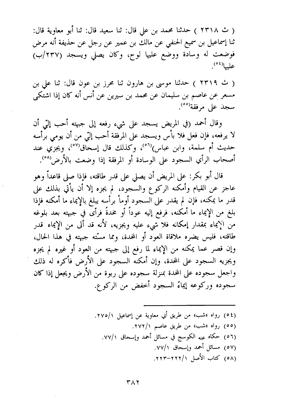 2319 - حَدَّثَنَا مُوسَى بْنُ هَارُونَ، ثنا مُحْرِزُ بْنُ عَوْنٍ، قَالَ: ثنا عَلِيُّ بْنُ مَسْهِرٍ، عَنْ عَاصِمِ بْنِ سُلَيْمَانَ، عَنْ مُحَمَّدِ بْنِ سِيرِينَ، عَنْ أَنَسٍ: «أَنَّهُ كَانَ إِذَا اشْتَكَى سَجَدَ عَلَى مِرْفَقَةٍ» وَقَالَ أَحْمَدُ: فِي الْمَرِيضِ يَسْجُدُ عَلَى شَيْءٍ رَفَعَهُ إِلَى جَبْهَتِهِ أَحَبُّ إِلَى أَنْ لَا يَرْفَعَهُ، فَإِنْ فَعَلَ فَلَا بَأْسَ وَيَسْجُدُ عَلَى الْمِرْفَقَةِ أَحَبُّ إِلَيَّ مِنْ أَنْ يَوْمِيَ بِرَأْسِهِ، حَدِيثُ أُمِّ سَلَمَةَ، وَابْنِ عَبَّاسٍ، وَكَذَلِكَ قَالَ إِسْحَاقُ، وَيُجْزِي عِنْدَ أَصْحَابِ الرَّأْيِ السُّجُودُ عَلَى الْوِسَادَةِ أَوِ الْمِرْفَقَةِ إِذَا وُضِعَتْ بِالْأَرْضِ. قَالَ أَبُو بَكْرٍ: عَلَى الْمَرِيضِ أَنْ يُصَلِّيَ عَلَى قَدْرِ طَاقَتِهِ، فَإِذَا صَلَّى قَاعِدًا وَهُوَ عَاجِزٌ عَنِ الْقِيَامِ وَأَمْكَنَهُ الرُّكُوعُ وَالسُّجُودُ، لَمْ يُجِزْهُ إِلَّا أَنْ يَأْتِيَ بِذَلِكَ عَلَى قَدْرِ مَا يُمْكِنُهُ، فَإِنْ لَمْ يَقْدِرْ عَلَى السُّجُودِ، أَوْمَأَ بِرَأْسِهِ يَبْلُغُ بِالْإِيمَاءِ مَا أَمْكَنَهُ فَإِذَا بَلَغَ مِنَ الْإِيمَاءِ مَا أَمْكَنَهُ، فَرَفَعَ إِلَيْهِ عُودًا أَوْ مُخَدَّةً فَرَأَى فِي جَبْهَتِهِ بَعْدَ بُلُوغِهِ مِنَ الْإِيمَاءِ بِمِقْدَارِ إِمْكَانِهِ فَلَا شَيْءَ عَلَيْهِ وَيُجْزِيهِ، لِأَنَّهُ قَدْ أَتَى مِنَ الْإِيمَاءِ قَدْرَ طَاقَتِهِ، فَلَيْسَ يَضُرُّهُ مُلَاقَاةُ الْعُودِ أَوِ الْمُخَدَّةِ، وَمِمَّا مَسَّتْهُ جَبْهَتُهُ فِي هَذَا الْحَالِ، وَإِنْ قَصَرَ عَمَّا يُمْكِنُهُ مِنَ الْإِيمَاءِ لَمَّا رَفَعَ إِلَى جَبْهَتِهِ مِنَ الْعُودِ أَوْ غَيْرِهِ لَمْ يُجِزْهُ وَيُجْزِيهِ السُّجُودُ عَلَى الْمُخَدَّةِ، وَإِنْ أَمْكَنَهُ السُّجُودُ عَلَى الْأَرْضِ فَأَكْرَهُ لَهُ ذَلِكَ، وَأَجْعَلُ سُجُودَهُ عَلَى الْمُخَدَّةِ بِمَنْزِلَةِ سُجُودِهِ عَلَى رَبْوَةٍ مِنَ الْأَرْضِ، وَيَجْعَلُ إِذَا كَانَ سُجُودُهُ وَرُكُوعُهُ إِيمَاءً السُّجُودَ أَخْفَضَ مِنَ الرُّكُوعِ