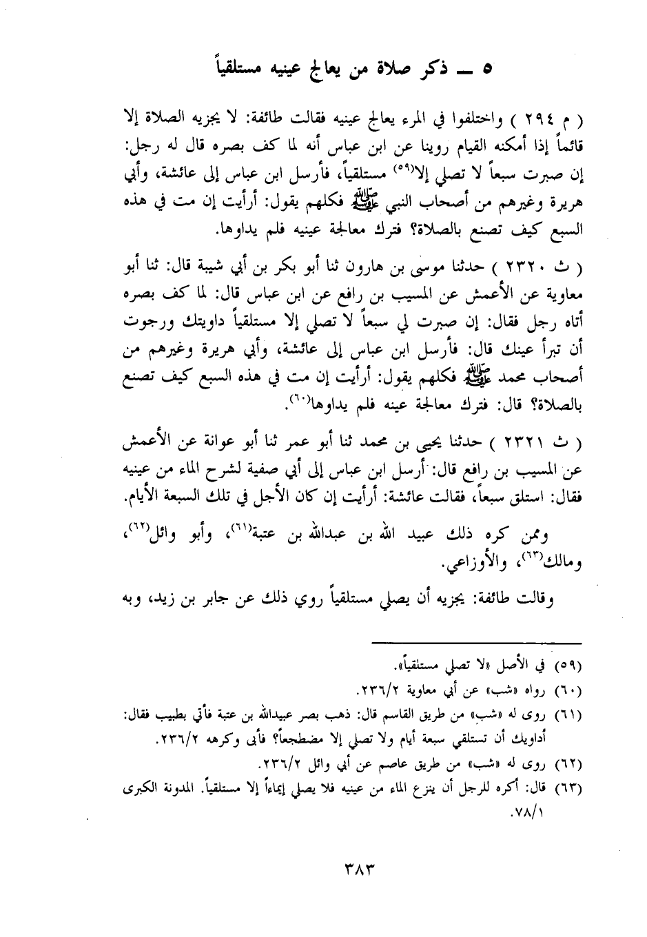 2320 - حَدَّثَنَا مُوسَى بْنُ هَارُونَ، ثنا أَبُو بَكْرِ بْنُ أَبِي شَيْبَةَ، قَالَ: ثنا أَبُو مُعَاوِيَةَ، عَنِ الْأَعْمَشِ، عَنِ الْمُسَيَّبِ بْنِ رَافِعٍ، عَنِ ابْنِ عَبَّاسٍ، قَالَ: " لَمَّا كُفَّ بَصَرُهُ أَتَاهُ رَجُلٌ فَقَالَ: إِنْ صَبَرْتَ لِي سَبْعًا لَا تُصَلِّي إِلَّا مُسْتَلْقِيًا دَاوَيْتُكَ وَرَجَوْتُ أَنْ تَبْرَأَ عَيْنُكَ قَالَ: فَأَرْسَلَ ابْنُ عَبَّاسٍ إِلَى عَائِشَةَ، وَأَبِي هُرَيْرَةَ، وَغَيْرِهِمْ مِنْ أَصْحَابِ مُحَمَّدٍ صَلَّى اللَّهُ عَلَيْهِ وَسَلَّمَ فَكُلُّهُمْ يَقُولُ: أَرَأَيْتَ إِنْ مِتَّ فِي هَذِهِ السَّبْعِ كَيْفَ تَصْنَعُ بِالصَّلَاةِ؟ قَالَ: فَتَرَكَ مُعَالَجَةَ عَيْنهِ فَلَمْ يُدَاوِهَا "