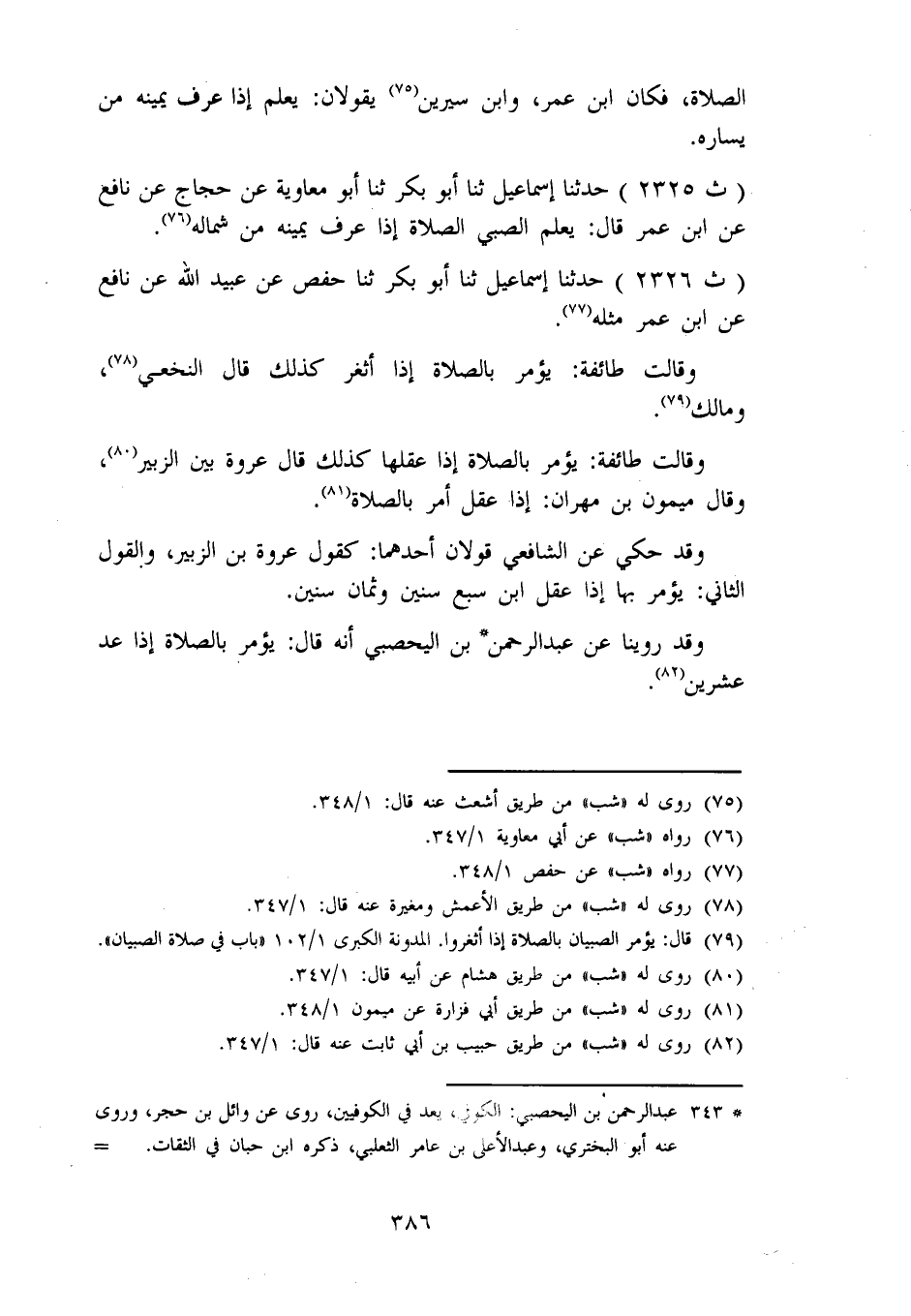 2326 - حَدَّثَنَا إِسْمَاعِيلُ، ثنا أَبُو بَكْرٍ، ثنا حَفْصٌ، عَنْ عُبَيْدِ اللهِ، عَنْ نَافِعٍ، عَنِ ابْنِ عُمَرَ، مِثْلَهُ وَقَالَتْ طَائِفَةٌ: يُؤْمَرُ بِالصَّلَاةِ إِذَا أَثْغَرَ، كَذَلِكَ قَالَ النَّخَعِيُّ، وَمَالِكٌ. وَقَالَتْ طَائِفَةٌ: يُؤْمَرُ بِالصَّلَاةِ إِذَا عَقَلَهَا، كَذَلِكَ قَالَ عُرْوَةُ بْنُ الزُّبَيْرِ، وَقَالَ مَيْمُونُ بْنُ مِهْرَانَ: إِذَا عَقَلَ أُمِرَ بِالصَّلَاةِ. وَقَدْ حُكِيَ عَنِ الشَّافِعِيِّ قَوْلَانِ، أَحَدُهُمَا كَقَوْلِ عُرْوَةَ بْنِ الزُّبَيْرِ، وَالْقَوْلُ الثَّانِي: يُؤْمَرُ إِذَا عَقَلَ ابْنُ سَبْعِ سِنِينَ وَثَمَانِ سِنِينَ. وَقَدْ رُوِّينَا عَنْ عَبْدِ الرَّحْمَنِ بْنِ الْيَحْصَبِيِّ أَنَّهُ قَالَ: يُؤْمَرُ بِالصَّلَاةِ إِذَا عَدَّ عِشْرِينَ