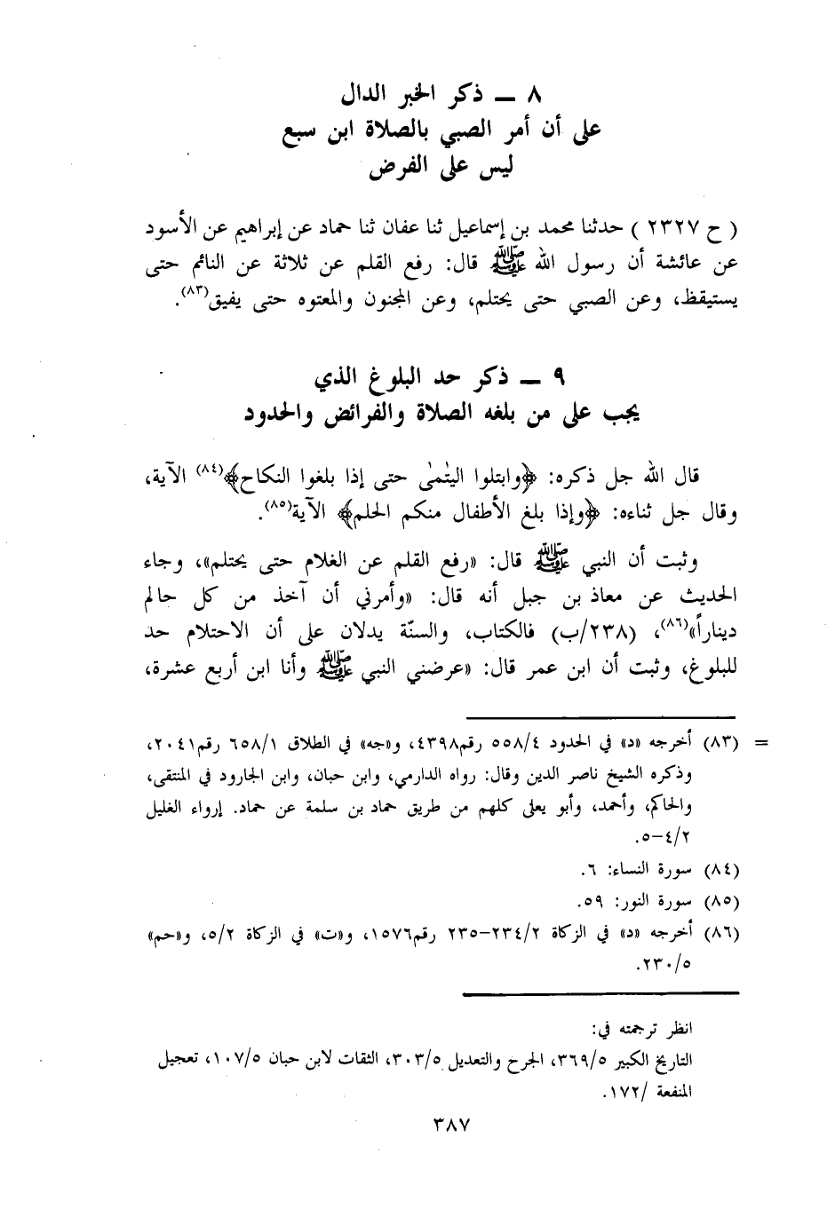 2327 - حَدَّثَنَا مُحَمَّدُ بْنُ إِسْمَاعِيلَ، ثنا عَفَّانُ، ثنا حَمَّادٌ، عَنْ إِبْرَاهِيمَ، عَنِ الْأَسْوَدِ، عَنْ عَائِشَةَ، أَنَّ رَسُولَ اللهِ صَلَّى اللَّهُ عَلَيْهِ وَسَلَّمَ قَالَ: «رُفِعَ الْقَلَمُ عَنْ ثَلَاثَةٍ؛ عَنِ النَّائِمِ حَتَّى يَسْتَيْقِظَ، وَعَنِ الصَّبِيِّ حَتَّى يَحْتَلِمَ، وَعَنِ الْمَجْنُونِ وَالْمَعْتُوهِ حَتَّى يُفِيقَ»