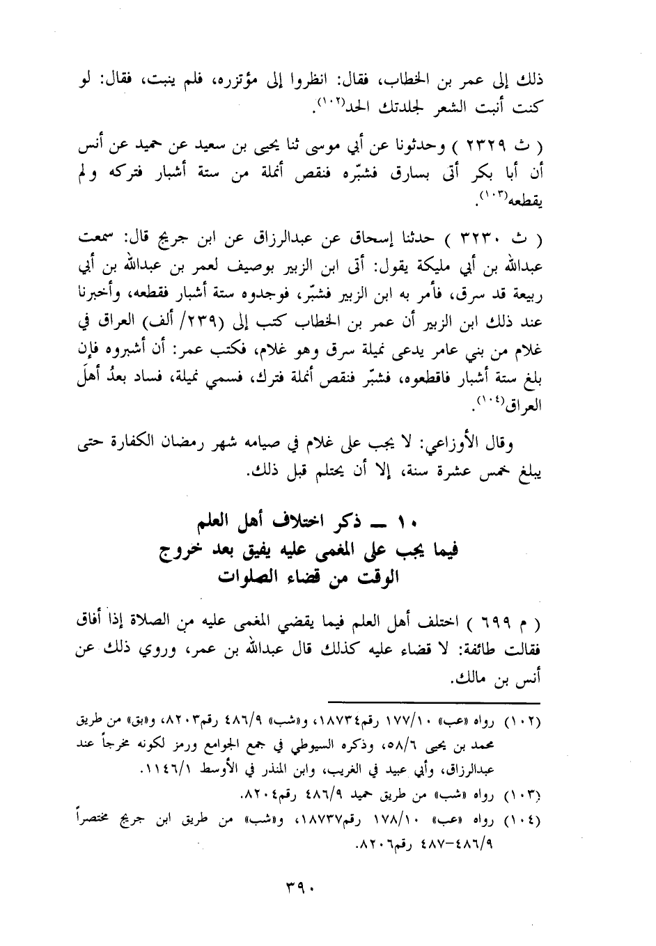 2330 - حَدَّثَنَا إِسْحَاقُ، عَنْ عَبْدِ الرَّزَّاقِ، عَنِ ابْنِ جُرَيْجٍ، قَالَ: سَمِعْتُ عَبْدَ اللهِ بْنَ أَبِي مُلَيْكَةَ، يَقُولُ: أُتِيَ ابْنُ الزُّبَيْرِ بِوَصِيفٍ لِعُمَرَ بْنِ عَبْدِ اللهِ بْنِ أَبِي رَبِيعَةَ قَدْ سَرَقَ فَأَمَرَ بِهِ ابْنُ الزُّبَيْرِ فَشُبِّرَ فَوَجَدُوهُ سِتَّةَ أَشْبَارٍ فَقَطَعَهُ، وَأَخْبَرَنَا عِنْدَ ذَلِكَ ابْنُ الزُّبَيْرِ أَنَّ عُمَرَ بْنَ الْخَطَّابِ: " كَتَبَ إِلَى الْعِرَاقِ فِي غُلَامٍ مِنْ بَنِي عَامِرٍ يُدْعَى نُمَيْلَةَ سَرَقَ وَهُوَ غُلَامٌ، فَكَتَبَ عُمَرُ: أَنْ أَشْبِرُوهُ فَإِنْ بَلَغَ سِتَّةَ أَشْبَارٍ فَاقْطَعُوهُ، فَشُبِّرَ فَنَقَصَ أُنْمُلَةً فَتُرِكَ، فَسُمِّيَ نُمَيْلَةَ، فَسَادَ بَعْدُ أَهْلَ الْعِرَاقِ " وَقَالَ الْأَوْزَاعِيُّ: لَا يَجِبُ عَلَى غُلَامٍ فِي صِيَامِهِ شَهْرَ رَمَضَانَ الْكَفَّارَةُ حَتَّى يَبْلُغَ خَمْسَ عَشْرَةَ سَنَةً، إِلَّا أَنْ يَحْتَلِمَ قَبْلَ ذَلِكَ