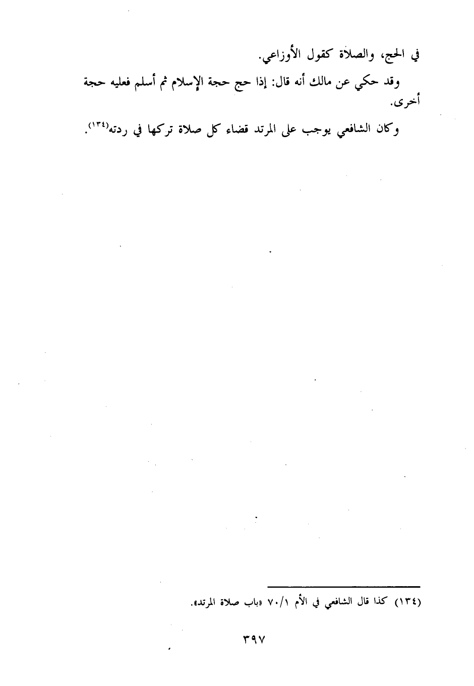 فِي الْحَجِّ، وَالصَّلَاةِ كَقَوْلِ الْأَوْزَاعِيِّ. وَقَدْ حُكِيَ عَنْ مَالِكٍ أَنَّهُ قَالَ: إِذَا حَجَّ حَجَّةَ الْإِسْلَامِ، ثُمَّ أَسْلَمَ فَعَلَيْهِ حَجَّةٌ أُخْرَى. وَكَانَ الشَّافِعِيُّ يُوجِبُ عَلَى الْمُرْتَدِّ قَضَاءَ كُلِّ صَلَاةٍ تَرَكَهَا فِي رَدَّتِهِ
