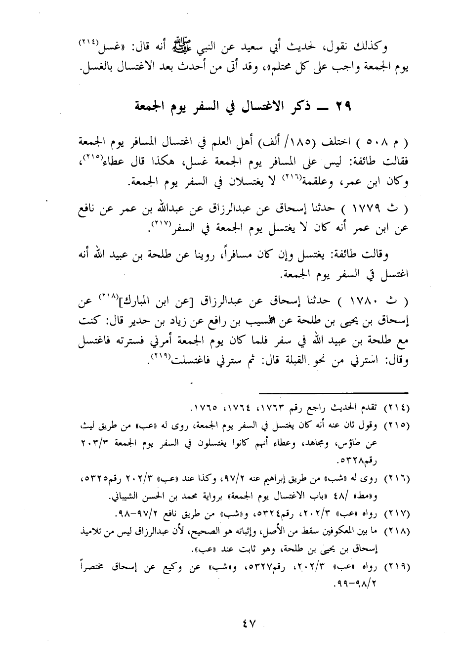 1779 - حَدَّثَنَا إِسْحَاقُ، عَنْ عَبْدِ الرَّزَّاقِ، عَنْ عَبْدِ اللهِ بْنِ عُمَرَ، عَنْ نَافِعٍ، عَنِ ابْنِ عُمَرَ، «أَنَّهُ كَانَ لَا يَغْتَسِلُ يَوْمَ الْجُمُعَةِ فِي السَّفَرِ» وَقَالَتْ طَائِفَةٌ: يَغْتَسِلُ وَإِنْ كَانَ مُسَافِرًا. رُوِّينَا عَنْ طَلْحَةَ بْنِ عُبَيْدِ اللهِ أَنَّهُ اغْتَسَلَ فِي السَّفَرِ يَوْمَ الْجُمُعَةِ