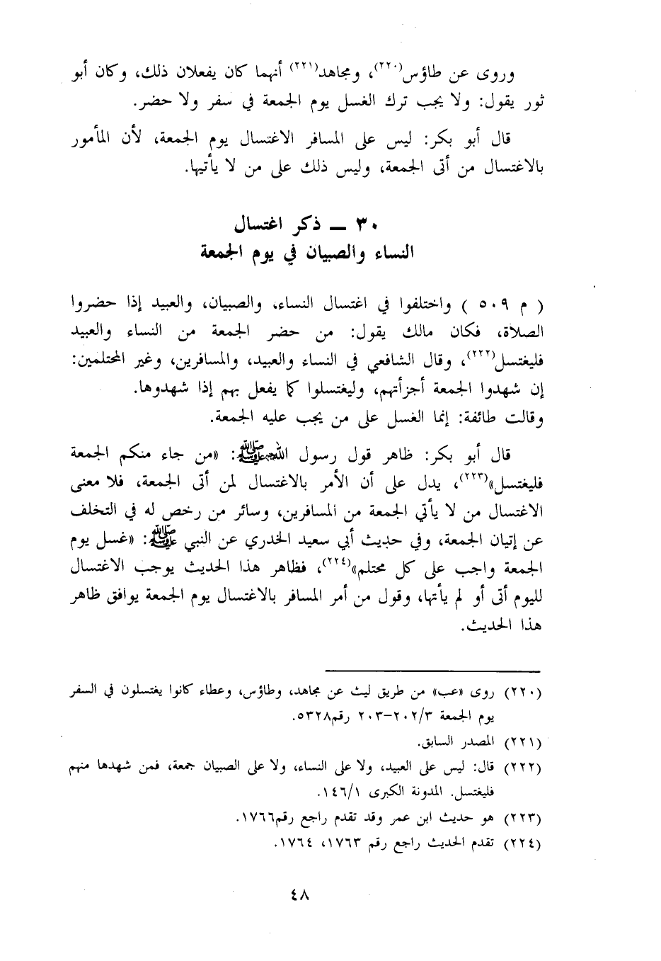 ذِكْرُ اغْتِسَالِ النِّسَاءِ وَالصِّبْيَانِ فِي يَوْمِ الْجُمُعَةِ وَاخْتَلَفُوا فِي اغْتِسَالِ النِّسَاءِ وَالصِّبْيَانِ وَالْعَبِيدِ إِذَا حَضَرُوا الصَّلَاةَ، فَكَانَ مَالِكٌ يَقُولُ: مَنْ حَضَرَ الْجُمُعَةَ مِنَ النِّسَاءِ وَالْعَبِيدِ فَلْيَغْتَسِلْ. وَقَالَ الشَّافِعِيُّ فِي النِّسَاءِ وَالْعَبِيدِ وَالْمُسَافِرِينَ وَغَيْرِ الْمُحْتَلِمِينَ: إِنْ شَهِدُوا الْجُمُعَةَ أَجْزَأَتْهُمْ، وَلْيَغْتَسِلُوا كَمَا يُفْعَلُ بِهِمْ إِذَا شَهِدُوهَا. وَقَالَتْ طَائِفَةٌ: إِنَّمَا الْغُسْلُ عَلَى مَنْ يَجِبُ عَلَيْهِ الْجُمُعَةُ قَالَ أَبُو بَكْرٍ: ظَاهِرُ قَوْلِ رَسُولِ اللهِ صَلَّى اللَّهُ عَلَيْهِ وَسَلَّمَ: «مَنْ جَاءَ مِنْكُمُ الْجُمُعَةَ فَلْيَغْتَسِلْ» يَدُلُّ عَلَى أَََّن الْأَمْرَ بِالِاغْتِسَالِ لِمَنْ أَتَى الْجُمُعَةَ، فَلَا مَعْنَى لِاغْتِسَالِ مَنْ لَا يَأْتِي الْجُمُعَةَ مِنَ الْمُسَافِرِينَ وَسَائِرِ مَنْ رُخِّصَ لَهُ فِي التَّخَلُّفِ عَنْ إِتْيَانِ الْجُمُعَةِ، وَفِي حَدِيثِ أَبِي سَعِيدٍ الْخُدْرِيِّ، عَنِ النَّبِيِّ صَلَّى اللَّهُ عَلَيْهِ وَسَلَّمَ: «غُسْلُ يَوْمِ الْجُمُعَةِ وَاجِبٌ عَلَى كُلِّ مُحْتَلِمٍ» ، فَظَاهِرُ هَذَا الْحَدِيثِ يُوجِبُ الِاغْتِسَالَ لِلْيَوْمِ أَتَى أَوْ لَمْ يَأْتِهَا، وَقَوْلُ مَنْ أَمَرَ الْمُسَافِرَ بِالِاغْتِسَالِ يَوْمَ الْجُمُعَةِ يُوَافِقُ ظَاهِرَ هَذَا الْحَدِيثِ
