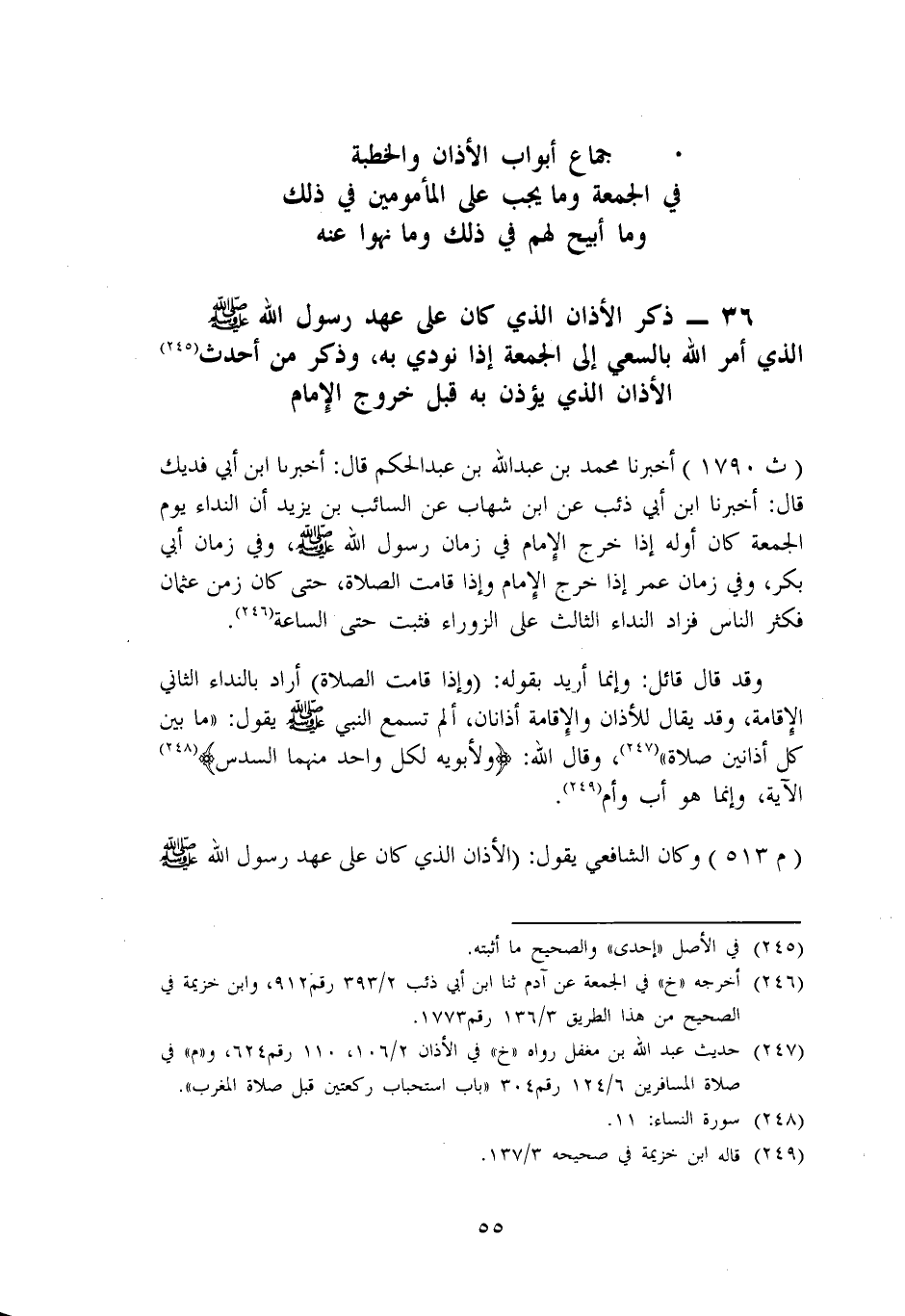 1790 - أَخْبَرَنَا مُحَمَّدُ بْنُ عَبْدِ اللهِ بْنِ عَبْدِ الْحَكَمِ، قَالَ: أَخْبَرَنَا ابْنُ أَبِي فُدَيْكٍ، قَالَ: أَخْبَرَنَا ابْنُ أَبِي ذِئْبٍ، عَنِ ابْنِ شِهَابٍ، عَنِ السَّائِبِ بْنِ يَزِيدَ، «أَنَّ النِّدَاءَ، يَوْمَ الْجُمُعَةِ كَانَ أَوَّلُهُ إِذَا خَرَجَ الْإِمَامُ فِي زَمَانِ رَسُولِ اللهِ صَلَّى اللَّهُ عَلَيْهِ وَسَلَّمَ، وَفِي زَمَانِ أَبِي بَكْرٍ، وَفِي زَمَانِ عُمَرَ إِذَا خَرَجَ الْإِمَامُ، وَإِذَا قَامَتِ الصَّلَاةُ، حَتَّى كَانَ زَمَنُ عُثْمَانَ، فَكَثُرَ النَّاسُ؛ فَزَادَ النِّدَاءَ الثَّالِثَ عَلَى الزَّوْرَاءِ، فَثَبَتَ حَتَّى السَّاعَةِ» وَقَدْ قَالَ قَائِلٌ: وَإِنَّمَا أُرِيدَ بِقَوْلِهِ: وَإِذَا قَامَتِ الصَّلَاةُ، أَرَادَ بِالنِّدَاءِ الثَّانِي الْإِقَامَةَ، وَقَدْ يُقَالُ لِلْأَذَانِ وَالْإِقَامَةِ أَذَانَانِ، أَلَمْ تَسْمَعِ النَّبِيَّ صَلَّى اللَّهُ عَلَيْهِ وَسَلَّمَ يَقُولُ: «مَا بَيْنَ كُلِّ أَذَانَيْنِ صَلَاةٌ» ، وَقَالَ اللهُ: {وَلِأَبَوَيْهِ لِكُلِّ وَاحِدٍ مِنْهُمَا السُّدُسُ} [النساء: 11] الْآيَةَ، وَإِنَّمَا هُوَ أَبٌ وَأُمٌّ وَكَانَ الشَّافِعِيُّ يَقُولُ: الْأَذَانُ الَّذِي كَانَ عَلَى عَهْدِ رَسُولِ اللهِ صَلَّى اللَّهُ عَلَيْهِ وَسَلَّمَ -[56]- أَحَبُّ إِلَيَّ. وَقَالَ أَصْحَابُ الرَّأْيِ: إِذَا صَعِدَ الْإِمَامُ عَلَى الْمِنْبَرِ يَوْمَ الْجُمُعَةِ أُذِّنَ قَالَ أَبُو بَكْرٍ: أَمَرَ عُثْمَانُ بْنُ عَفَّانَ لَمَّا كَثُرَ النَّاسُ بِالنِّدَاءِ الثَّالِثِ فِي الْعَدَدِ، وَهُوَ الْأَوَّلُ الَّذِي بَدَأَ بِهِ بَعْدَ زَوَالِ الشَّمْسِ بَيْنَ الْمُهَاجِرِينَ وَالْأَنْصَارِ، فَلَمْ يَكْرَهْ أَحَدٌ مِنْهُمْ عَلِمْنَاهُ، ثُمَّ مَضَتِ الْأُمَّةُ عَلَيْهِ إِلَى زَمَانِنَا هَذَا