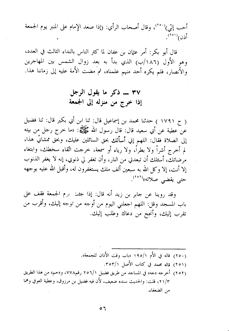 1791 - حَدَّثَنَا مُحَمَّدُ بْنُ إِسْمَاعِيلَ، قَالَ: ثنا ابْنُ أَبِي بُكَيْرٍ، قَالَ: ثنا فُضَيْلٌ، عَنْ عَطِيَّةَ، عَنْ أَبِي سَعِيدٍ قَالَ: قَالَ رَسُولُ اللهِ صَلَّى اللَّهُ عَلَيْهِ وَسَلَّمَ: " مَا خَرَجَ رَجُلٌ مِنْ بَيْتِهِ إِلَى الصَّلَاةِ، فَقَالَ: اللهُمَّ إِنِّي أَسْأَلُكَ بِحَقِّ السَّائِلِينَ عَلَيْكَ، وَبِحَقِّ مَمْشَائِيَ هَذَا، لَمْ أَخْرُجْ أَشَرًا وَلَا بَطَرًا، وَلَا رِيَاءً أَوْ سُمْعَةً، خَرَجْتُ اتِّقَاءَ سَخَطِكَ، وَابْتِغَاءَ مَرْضَاتِكَ، أَسْأَلُكَ أَنْ تُبْعِدَنِي مِنَ النَّارِ، وَأَنْ تَغْفِرَ لِي ذُنُوبِي، إِنَّهُ لَا يَغْفِرُ الذُّنُوبَ إِلَّا أَنْتَ، إِلَّا وَكَّلَ اللهُ بِهِ سَبْعِينَ أَلْفَ مَلَكٍ يَسْتَغْفِرُونَ لَهُ، وَأَقْبَلَ اللهُ عَلَيْهِ بِوَجْهِهِ حَتَّى يَقْضِيَ صَلَاتَهُ " وَقَدْ رُوِّينَا عَنْ جَابِرِ بْنِ زَيْدٍ أَنَّهُ قَالَ: إِذَا جِئْتَ يَوْمَ الْجُمُعَةِ فَقِفْ عَلَى بَابِ الْمَسْجِدِ، وَقُلِ: اللهُمَّ اجْعَلْنِي الْيَوْمَ مِنْ أَوْجَهِ مَنْ تَوَجَّهِ إِلَيْكَ، وَأَقْرَبِ مَنْ تَقَرَّبَ إِلَيْكَ، وَأَنْجَحِ مَنْ دَعَاكَ وَطَلَبَ إِلَيْكَ