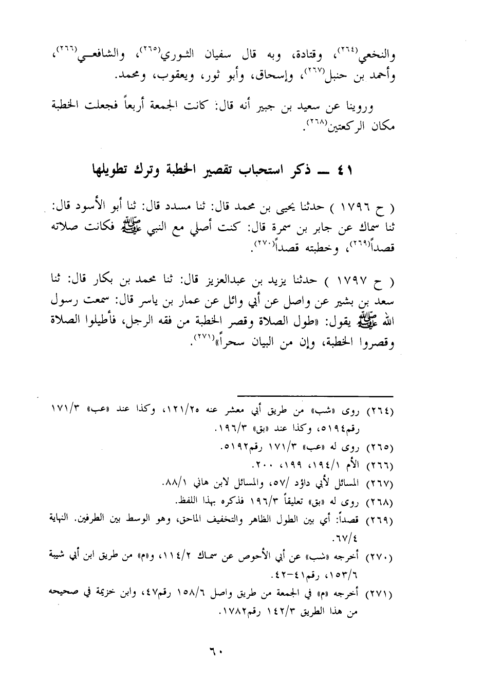 1797 - حَدَّثَنَا يَزِيدُ بْنُ عَبْدِ الْعَزِيزِ، قَالَ: ثنا مُحَمَّدُ بْنُ بَكَّارٍ، قَالَ: ثنا سَعْدُ بْنُ بَشِيرٍ، عَنْ وَاصِلٍ، عَنْ أَبِي وَائِلٍ، عَنْ عَمَّارِ بْنِ يَاسِرٍ، قَالَ: سَمِعْتُ رَسُولَ اللهِ صَلَّى اللَّهُ عَلَيْهِ وَسَلَّمَ يَقُولُ: «طُولُ الصَّلَاةِ وَقِصَرُ الْخُطْبَةِ مِنْ فِقْهِ الرَّجُلِ، فَأَطِيلُوا الصَّلَاةَ، وَقَصِّرُوا الْخُطْبَةَ، وَإِنَّ مِنَ الْبَيَانِ سِحْرًا»
