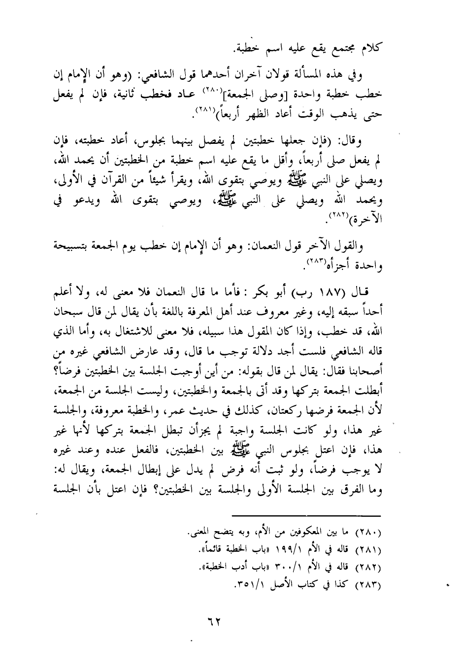 كَلَامًا مُجْتَمِعًا يَقَعُ عَلَيْهِ اسْمُ خُطْبَةٍ. وَفِي هَذِهِ الْمَسْأَلَةِ قَوْلَانِ آخَرَانِ: إِحْدَاهُمَا قَوْلُ الشَّافِعِيِّ: وَهُوَ أَنَّ الْإِمَامَ إِنْ خَطَبَ خُطْبَةً وَاحِدَةً وَصَلِّي الْجُمُعَةَ، عَادَ فَخَطَبَ ثَانِيَةً، فَإِنْ لَمْ يَفْعَلْ حَتَّى يَذْهَبَ الْوَقْتُ أَعَادَ الظُّهْرَ أَرْبَعًا. وَقَالَ: فَإِنْ جَعَلَهَا خُطْبَتَيْنِ لَمْ يَفْصِلْ بَيْنَهُمَا بِجُلُوسٍ، أَعَادَ خُطْبَتَهُ، فَإِنْ لَمْ يَفْعَلْ صَلَّى أَرْبَعًا، وَأَقَلُّ مَا يَقَعُ عَلَيْهِ اسْمُ خُطْبَةٍ مِنَ الْخُطْبَتَيْنِ أَنْ يَحْمَدَ اللهَ، وَيُصَلِّي عَلَى النَّبِيِّ صَلَّى اللَّهُ عَلَيْهِ وَسَلَّمَ، وَيُوصِي بِتَقْوَى اللهِ، وَيَقْرَأُ شَيْئًا مِنَ الْقُرْآنِ فِي الْأُولَى، وَيَحْمَدُ اللهَ، وَيُصَلِّي عَلَى النَّبِيِّ صَلَّى اللَّهُ عَلَيْهِ وَسَلَّمَ، وَيُوصِي بِتَقْوَى اللهِ وَيَدْعُو فِي الْآخِرَةِ. وَالْقَوْلُ الْآخَرُ قَوْلُ النُّعْمَانِ: هُوَ أَنَّ الْإِمَامَ إِنْ خَطَبَ يَوْمَ الْجُمُعَةِ بِتَسْبِيحَةٍ وَاحِدَةٍ أَجْزَأَهُ. قَالَ أَبُو بَكْرٍ: فَأَمَّا مَا قَالَ النُّعْمَانُ فَلَا مَعْنَى لَهُ، وَلَا أَعْلَمُ أَحَدًا سَبَقَهُ إِلَيْهِ، وَغَيْرُ مَعْرُوفٍ عِنْدَ أَهْلِ الْمَعْرِفَةِ بِاللُّغَةِ بِأَنْ يُقَالَ لِمَنْ قَالَ سُبْحَانَ اللهِ قَدْ خَطَبَ، وَإِذَا كَانَ الْمَقُولُ هَذَا سَبِيلُهُ، فَلَا مَعْنَى لِلِاشْتِغَالِ بِهِ، وَأَمَّا الَّذِي قَالَهُ الشَّافِعِيُّ فَلَسْتُ أَجِدُ دَلَالَةً تُوجِبُ مَا قَالَ، وَقَدْ عَارِضَ الشَّافِعِيُّ غَيْرَهُ مِنْ أَصْحَابِنَا فَقَالَ: يُقَالُ لِمَنْ قَالَ بِقَوْلِهِ: مِنْ أَيْنَ أَوْجَبْتَ الْجِلْسَةَ بَيْنَ الْخُطْبَتَيْنِ فَرْضًا؟ أَبَطَلَتِ الْجُمُعَةُ بِتَرْكِهَا وَقَدْ أَتَى بِالْجُمُعَةِ وَالْخُطْبَتَيْنِ، وَلَيْسَتِ الْجِلْسَةُ مِنَ الْجُمُعَةِ؛ لِأَنَّ الْجُمُعَةِ فَرْضُهَا رَكْعَتَانِ، كَذَلِكَ فِي حَدِيثِ عُمَرَ، وَالْخُطْبَةُ مَعْرُوفَةٌ، وَالْجِلْسَةُ غَيْرُ هَذَا، وَلَوْ كَانَتِ الْجِلْسَةُ وَاجِبَةٌ لَمْ يُجِزْ أَنْ تَبْطُلَ الْجُمُعَةُ بِتَرْكِهَا؛ لِأَنَّهَا غَيْرُ هَذَا، فَإِنِ اعْتَلَّ بِجُلُوسِ النَّبِيِّ صَلَّى اللَّهُ عَلَيْهِ وَسَلَّمَ بَيْنَ الْخُطْبَتَيْنِ، فَالْفِعْلُ عِنْدَهُ وَعِنْدَ غَيْرِهِ لَا يُوجِبُ فَرْضًا، وَلَوْ ثَبَتَ أَنَّهُ فَرْضٌ لَمْ يَدُلَّ عَلَى إِبْطَالِ الْجُمُعَةِ، وَيُقَالُ لَهُ: وَمَا الْفَرْقُ بَيْنَ الْجِلْسَةِ الْأُولَى وَالْجِلْسَةِ بَيْنَ الْخُطْبَتَيْنِ؟ فَإِنِ اعْتَلَّ بِأَنَّ الْجِلْسَةَ