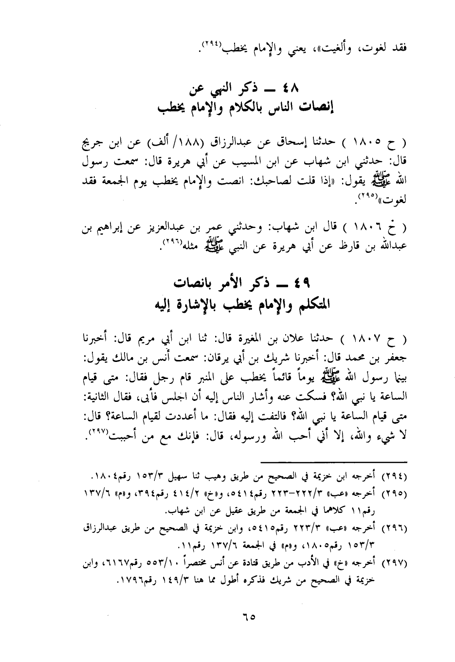 1807 - حَدَّثَنَا عَلَّانُ بْنُ الْمُغِيرَةِ، قَالَ: ثنا ابْنُ أَبِي مَرْيَمَ، قَالَ: أَخْبَرَنَا جَعْفَرُ بْنُ مُحَمَّدٍ، قَالَ: أَخْبَرَنَا شَرِيكُ بْنُ أَبِي يَرْقَانَ: سَمِعْتُ أَنَسَ بْنَ مَالِكٍ، يَقُولُ: بَيْنَمَا رَسُولُ اللهِ صَلَّى اللَّهُ عَلَيْهِ وَسَلَّمَ يَوْمًا قَائِمًا يَخْطُبُ عَلَى الْمِنْبَرِ، قَامَ رَجُلٌ فَقَالَ: مَتَى قِيَامُ السَّاعَةِ يَا نَبِيَّ اللهِ؟ فَسَكَتَ عَنْهُ، وَأَشَارَ النَّاسُ إِلَيْهِ أَنِ اجْلِسْ فَأَبَى، فَقَالَ الثَّانِيَةَ: مَتَى قِيَامُ السَّاعَةِ يَا نَبِيَّ اللهِ؟ فَالْتَفَتَ إِلَيْهِ، فَقَالَ: «مَا أَعْدَدْتَ لَقِيَامِ السَّاعَةِ» ؟ قَالَ: لَا شَيْءَ وَاللهِ، إِلَّا أَنِّي أُحِبُّ اللهَ وَرَسُولَهُ. قَالَ: «فَإِنَّكَ مَعَ مَنْ أَحْبَبْتَ» -[66]- وَاخْتَلَفُوا فِي الْكَلَامِ وَالْإِمَامُ يَخْطُبُ يَوْمَ الْجُمُعَةِ، فَمِمَّنْ نَهَى عَنْ ذَلِكَ عُثْمَانُ بْنُ عَفَّانَ، وَعَبْدُ اللهِ بْنُ عُمَرَ، وَقَالَ عَبْدُ اللهِ بْنُ مَسْعُودٍ: إِذَا رَأَيْتَهُ يَتَكَلَّمُ وَالْإِمَامُ يَخْطُبُ فَاقْرَعْ رَأْسَهُ بِالْعَصَا. وَكَرِهَ ذَلِكَ ابْنُ عَبَّاسٍ، وَالشَّافِعِيُّ، وَعَوَامُّ أَهْلِ الْفُتْيَا