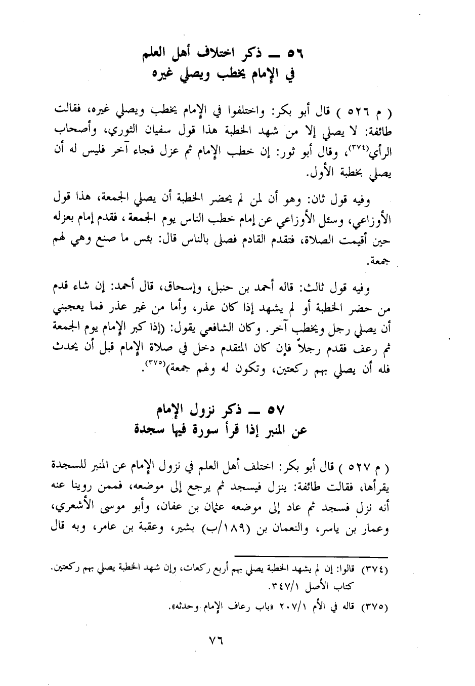 ذِكْرُ نُزُولِ الْإِمَامِ عَنِ الْمِنْبَرِ إِذَا قَرَأَ سُورَةً فِيهَا سَجْدَةٌ قَالَ أَبُو بَكْرٍ: " اخْتَلَفَ أَهْلُ الْعِلْمِ فِي نُزُولِ الْإِمَامِ عَنِ الْمِنْبَرِ لِلسَّجْدَةِ يَقْرَؤُهَا، فَقَالَتْ طَائِفَةٌ: يَنْزِلُ فَيَسْجُدُ ثُمَّ يَرْجِعُ إِلَى مَوْضِعِهِ. فَمِمَّنْ رُوِّينَا عَنْهُ أَنَّهُ نَزَلَ فَسَجَدَ ثُمَّ عَادَ إِلَى مَوْضِعِهِ عُثْمَانُ بْنُ عَفَّانَ، وَأَبُو مُوسَى الْأَشْعَرِيُّ، وَعَمَّارُ بْنُ يَاسِرٍ، وَالنُّعْمَانُ بْنُ بَشِيرٍ، وَعُقْبَةُ بْنُ عَامِرٍ، وَبِهِ قَالَ -[77]- أَصْحَابُ الرَّأْيِ "