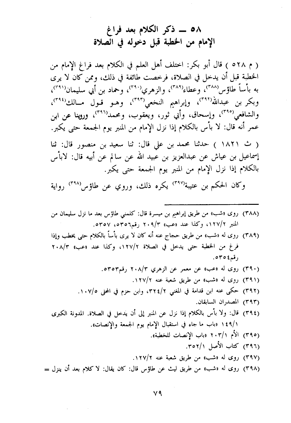 ذِكْرُ الْكَلَامِ بَعْدَ فَرَاغِ الْإِمَامِ مِنَ الْخُطْبَةِ قَبْلَ دُخُولِهِ فِي الصَّلَاةِ قَالَ أَبُو بَكْرٍ: اخْتَلَفَ أَهْلُ الْعِلْمِ فِي الْكَلَامِ بَعْدَ فَرَاغِ الْإِمَامِ مِنَ الْخُطْبَةِ قَبْلَ أَنْ يَدْخُلَ فِي الصَّلَاةِ، فَرَخَّصَتْ طَائِفَةٌ فِي ذَلِكَ، وَمِمَّنْ كَانَ لَا يَرَى بِهِ بَأْسًا طَاوُسٌ، وَعَطَاءٌ، وَالزُّهْرِيُّ، وَحَمَّادُ بْنُ أَبِي سُلَيْمَانَ، وَبَكْرُ بْنُ عَبْدِ اللهِ، وَإِبْرَاهِيمُ النَّخَعِيُّ، وَهُوَ قَوْلُ مَالِكٍ، وَالشَّافِعِيِّ، وَإِسْحَاقَ، وَأَبِي ثَوْرٍ، وَيَعْقُوبَ، وَمُحَمَّدٍ، وَرُوِّينَا عَنِ ابْنِ عُمَرَ أَنَّهُ قَالَ: لَا بَأْسَ بِالْكَلَامِ إِذَا نَزَلَ الْإِمَامُ مِنَ الْمِنْبَرِ يَوْمَ الْجُمُعَةِ حَتَّى يُكَبِّرَ "