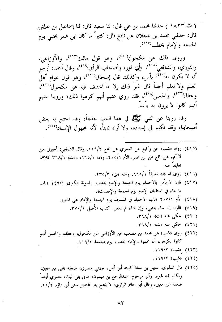 1823 - حَدَّثَنَا مُحَمَّدُ بْنُ عَلِيٍّ، قَالَ: ثنا سَعِيدٌ، قَالَ: ثنا إِسْمَاعِيلُ بْنُ عَيَّاشٍ، قَالَ: حَدَّثَنِي مُحَمَّدُ بْنُ عَجْلَانَ، عَنْ نَافِعٍ، قَالَ: «كَثِيرًا مَا كَانَ ابْنُ عُمَرَ يَحْتَبِي يَوْمَ الْجُمُعَةِ، وَالْإِمَامُ يَخْطُبُ» . وَرُوِيَ ذَلِكَ عَنْ مَكْحُولٍ، وَهُوَ قَوْلُ مَالِكٍ، وَالْأَوْزَاعِيِّ، وَالثَّوْرِيِّ، وَالشَّافِعِيِّ، وَأَبِي ثَوْرٍ، وَأَصْحَابِ الرَّأْيِ، وَقَالَ أَحْمَدُ: أَرْجُو أَنْ لَا يَكُونَ بِهِ بَأْسٌ، وَكَذَلِكَ قَالَ إِسْحَاقُ، وَهُوَ قَوْلُ عَوَامِّ أَهْلِ الْعِلْمِ، وَلَا نَعْلَمُ أَحَدًا، قَالَ غَيْرَ ذَلِكَ، إِلَّا مَا اخْتُلِفَ فِيهِ عَنْ مَكْحُولٍ، وَعَطَاءٍ، وَالْحَسَنِ، فَقَدْ رُوِيَ عَنْهُمْ أَنَّهُمْ كَرِهُوا ذَلِكَ، وَرُوِّينَا عَنْهُمْ أَنَّهُمْ كَانُوا لَا يَرَوْنَ بِهِ بَأْسًا وَقَدْ رُوِّينَا عَنْ النَّبِيِّ صَلَّى اللَّهُ عَلَيْهِ وَسَلَّمَ فِي هَذَا الْبَابِ حَدِيثًا، وَقَدِ احْتَجَّ بِهِ بَعْضُ أَصْحَابِنَا، وَقَدْ تُكُلِّمَ فِي إِسْنَادِهِ، وَلَا أَرَاهُ ثَابِتًا؛ لِأَنَّهُ مَجْهُولُ الْإِسْنَادِ