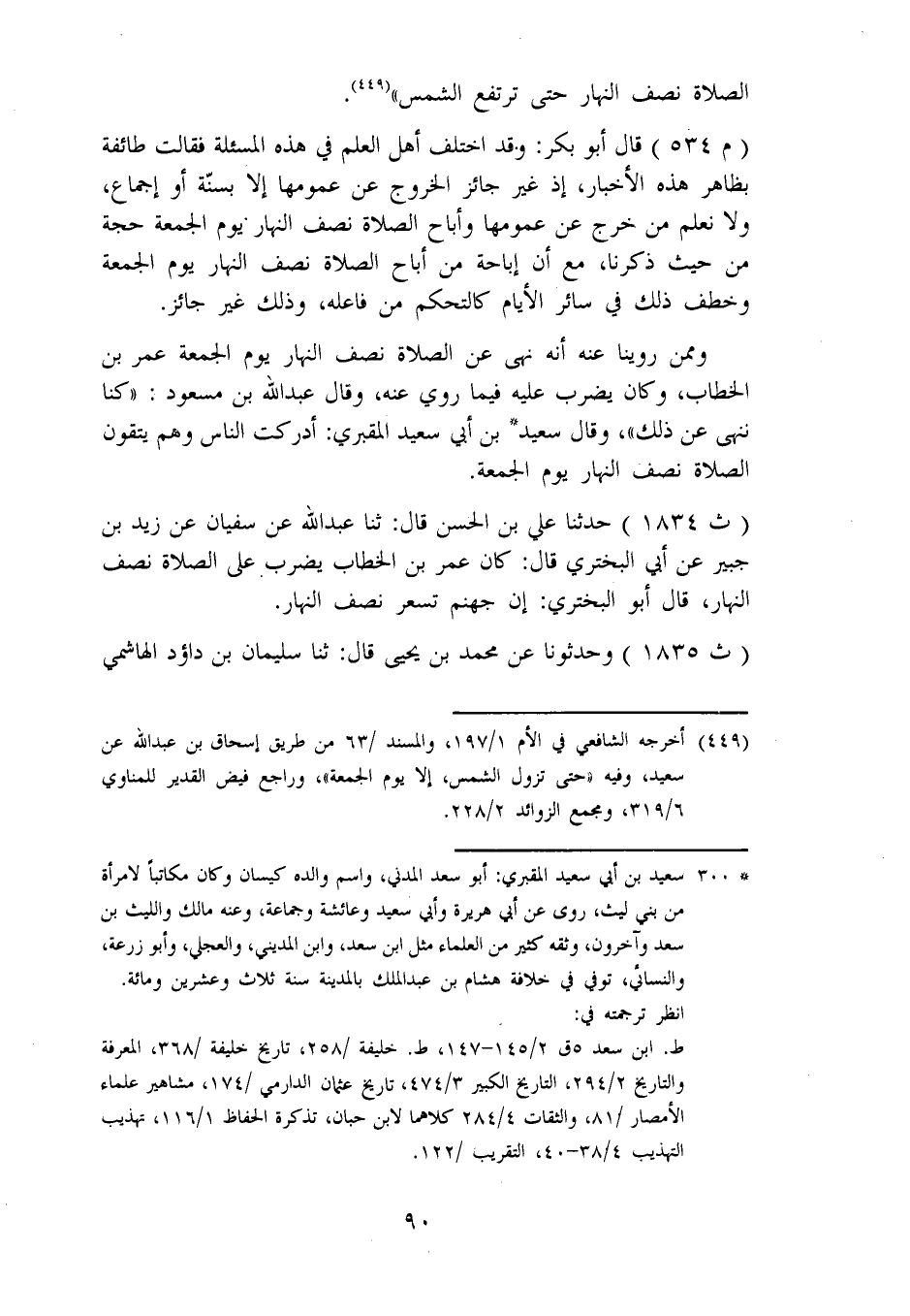 1834 - حَدَّثَنَا عَلِيُّ بْنُ الْحَسَنِ، قَالَ: ثنا عَبْدُ اللهِ، عَنْ سُفْيَانَ، عَنْ زَيْدِ بْنِ جُبَيْرٍ، عَنْ أَبِي الْبَخْتَرِيِّ، قَالَ: كَانَ عُمَرُ بْنُ الْخَطَّابِ يَضْرِبُ عَلَى الصَّلَاةِ نِصْفَ النَّهَارِ ". قَالَ أَبُو الْبَخْتَرِيِّ: إِنَّ جَهَنَّمَ تُسَعَّرُ نِصْفَ النَّهَارِ