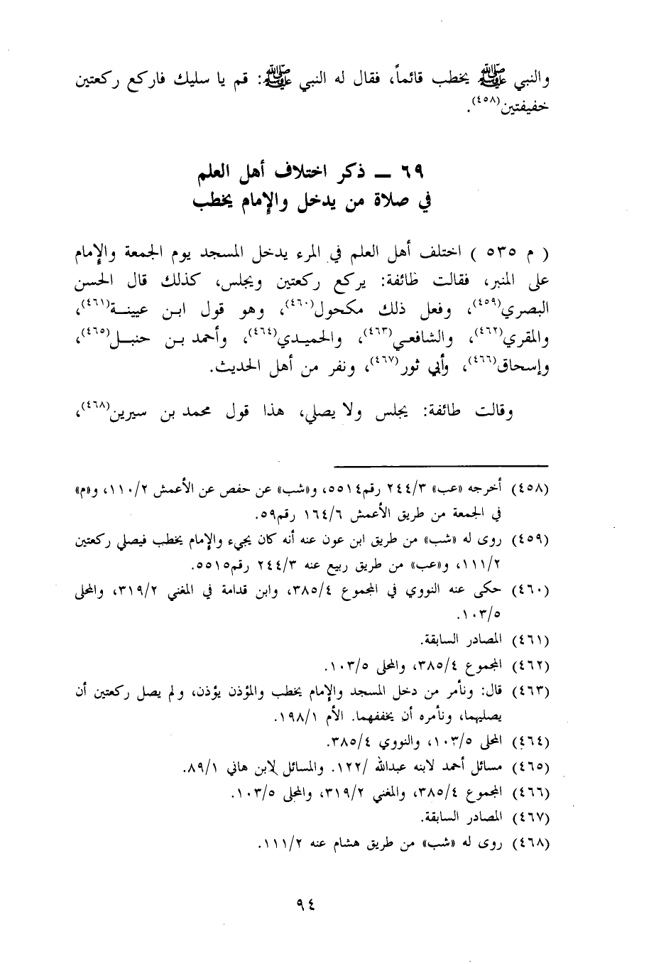 ذِكْرُ اخْتِلَافِ أَهْلِ الْعِلْمِ فِي صَلَاةِ مَنْ يَدْخُلُ، وَالْإِمَامُ يَخْطُبُ اخْتَلَفَ أَهْلُ الْعِلْمِ فِي الْمَرْءِ يَدْخُلُ الْمَسْجِدَ يَوْمَ الْجُمُعَةِ، وَالْإِمَامُ عَلَى الْمِنْبَرِ، فَقَالَتْ طَائِفَةٌ: يَرْكَعُ رَكْعَتَيْنِ، وَيَجْلِسُ، كَذَلِكَ قَالَ الْحَسَنُ الْبَصْرِيُّ، وَفَعَلَ ذَلِكَ مَكْحُولٌ، وَهُوَ قَوْلُ ابْنِ عُيَيْنَةَ، وَالْمُقْرِيِّ، وَالشَّافِعِيِّ، وَالْحُمَيْدِيِّ، وَأَحْمَدَ بْنِ حَنْبَلٍ، وَإِسْحَاقَ، وَأَبِي ثَوْرٍ، وَنَفَرٍ مِنْ أَهْلِ الْحَدِيثِ. وَقَالَ طَائِفَةٌ: يَجْلِسُ، وَلَا يُصَلِّي، هَذَا قَوْلُ مُحَمَّدِ بْنِ سِيرِينَ،
