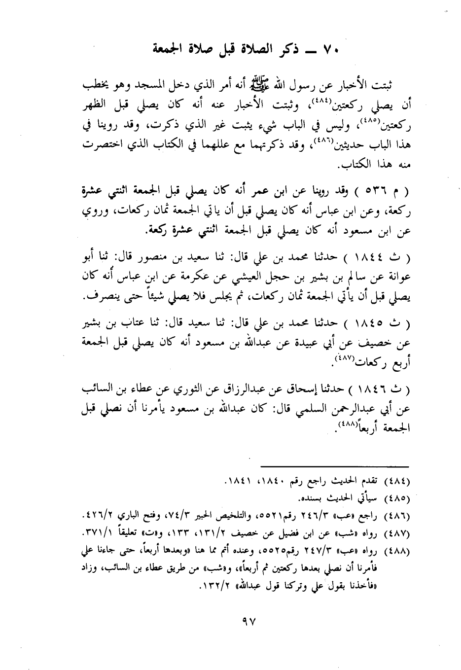1845 - حَدَّثَنَا مُحَمَّدُ بْنُ عَلِيٍّ، قَالَ: ثَنَا سَعِيدٌ، قَالَ: ثنا عَتَّابُ بْنُ بَشِيرٍ، عَنْ خُصَيْفٍ، عَنْ أَبِي عُبَيْدَةَ، عَنْ عَبْدِ اللهِ بْنِ مَسْعُودٍ: «أَنَّهُ كَانَ يُصَلِّي قَبْلَ الْجُمُعَةِ أَرْبَعَ رَكَعَاتٍ»