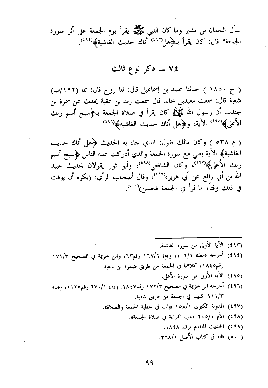1850 - حَدَّثَنَا مُحَمَّدُ بْنُ إِسْمَاعِيلَ، قَالَ: ثنا رَوْحٌ، قَالَ: ثنا شُعْبَةُ، قَالَ: سَمِعْتُ مَعْبَدَ بْنَ خَالِدٍ، قَالَ: سَمِعْتُ زَيْدَ بْنَ عُقْبَةَ، يُحَدِّثُ عَنْ سَمُرَةَ بْنِ جُنْدُبٍ: «أَنَّ رَسُولَ اللهِ صَلَّى اللَّهُ عَلَيْهِ وَسَلَّمَ كَانَ يَقْرَأُ فِي صَلَاةِ الْجُمُعَةِ بِـ سَبِّحِ اسْمَ رَبِّكَ الْأَعْلَى، الْآيَةَ، وَهَلْ أَتَاكَ حَدِيثُ الْغَاشِيَةِ» . وَكَانَ مَالِكٌ يَقُولُ: الَّذِي جَاءَ بِهِ الْحَدِيثُ: هَلْ أَتَاكَ حَدِيثُ الْغَاشِيَةِ الْآيَةَ، يَعْنِي مَعَ سُورَةِ الْجُمُعَةِ، وَالَّذِي أَدْرَكْتُ عَلَيْهِ النَّاسَ: سَبِّحِ اسْمَ رَبِّكَ الْأَعْلَى، وَكَانَ الشَّافِعِيُّ، وَأَبُو ثَوْرٍ يَقُولَانِ بِحَدِيثِ عُبَيْدِ اللهِ بْنِ أَبِي رَافِعٍ، عَنْ أَبِي هُرَيْرَةَ، وَقَالَ أَصْحَابُ الرَّأْيِ: يُكْرَهُ أَنْ يُوَقِّتَ فِي ذَلِكَ وَقْتًا، مَا قَرَأَ فِي الْجُمُعَةِ فَحَسَنٌ