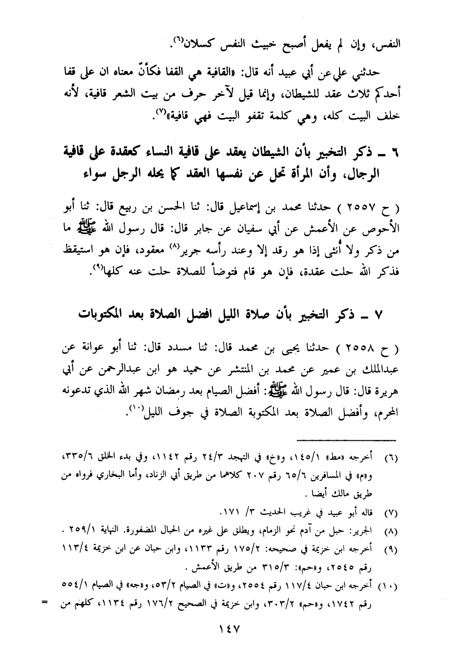 ذِكْرُ التَّخْبِيرِ بِأَنَّ الشَّيْطَانَ يَعْقِدُ عَلَى قَافِيَةِ النِّسَاءِ كَعَقْدِةٍ عَلَى قَافِيَةِ الرِّجَالِ، وَأَنَّ الْمَرْأَةَ تَحُلُّ عَنْ نَفْسِهَا الْعُقَدَ كَمَا يَحُلُّهُ الرَّجُلُ سَوَاءً