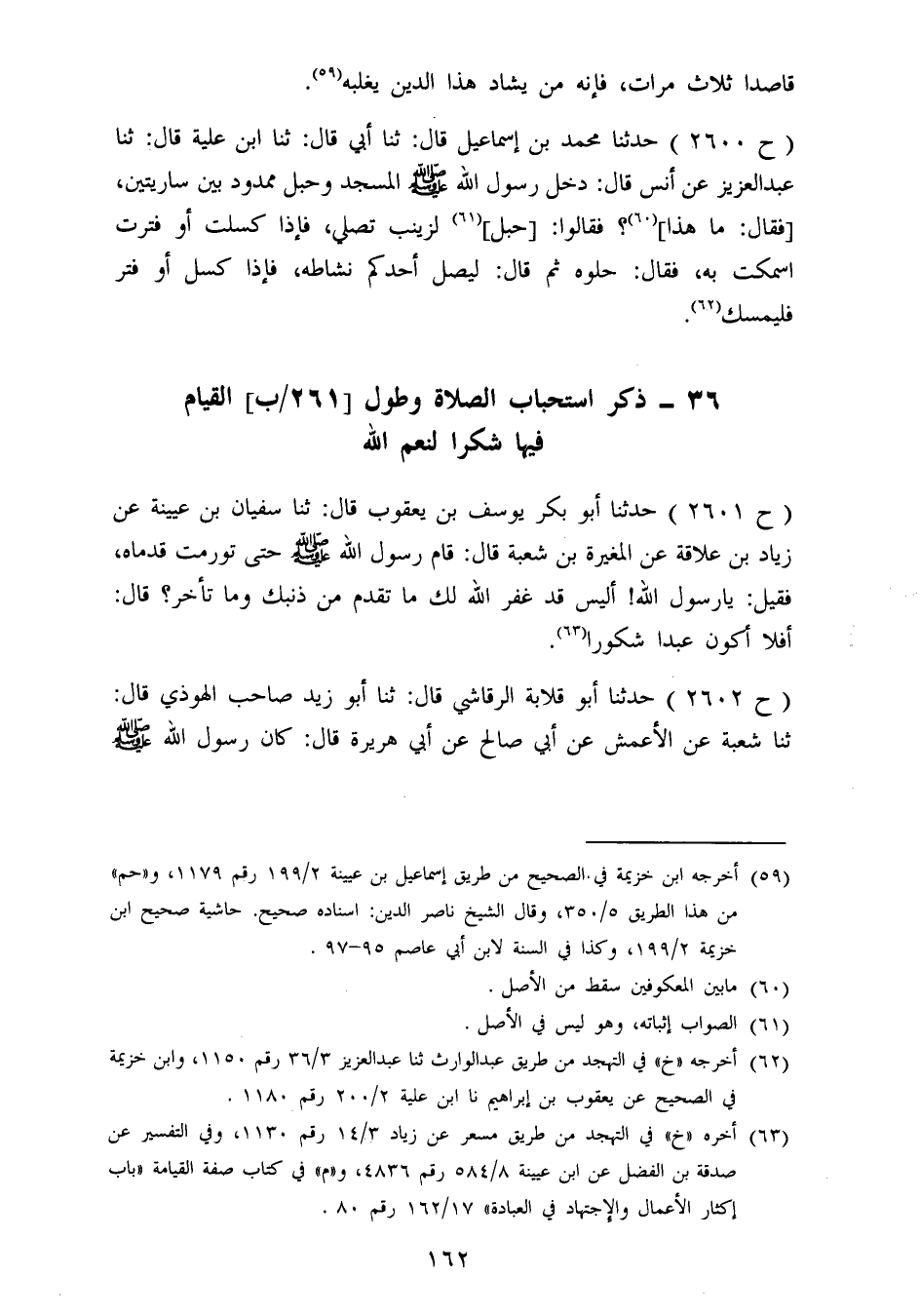 2601 - حَدَّثَنَا أَبُو بَكْرٍ يُوسُفُ بْنُ يَعْقُوبَ قَالَ: ثنا سُفْيَانُ بْنُ عُيَيْنَةَ، عَنْ زِيَادِ بْنِ عِلَاقَةَ، عَنِ الْمُغِيرَةِ بْنِ شُعْبَةَ، قَالَ: قَامَ رَسُولُ اللهِ صَلَّى اللَّهُ عَلَيْهِ وَسَلَّمَ حَتَّى تَوَرَّمَتْ قَدَمَاهُ، فَقِيلَ: يَا رَسُولَ اللهِ، أَلَيْسَ قَدْ غَفَرَ اللهُ لَكَ مَا تَقَدَّمَ مِنْ ذَنْبِكَ وَمَا تَأَخَّرَ؟، قَالَ: «أَفَلَا أَكُونُ عَبْدًا شَكُورًا»