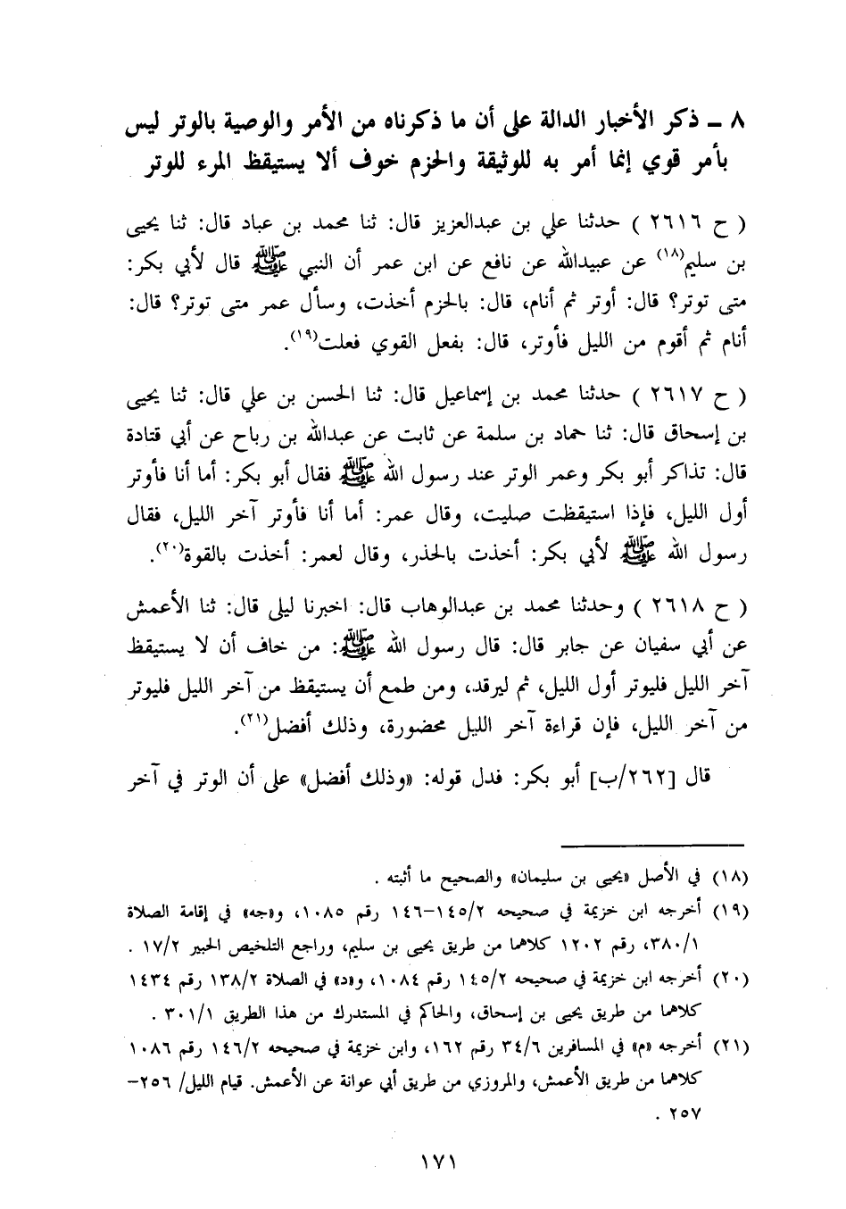 2618 - وَحَدَّثنَا مُحَمَّدُ بْنُ عَبْدِ الْوَهَّابِ، قَالَ: أَخْبَرَنَا ابْنِ أَبِي لَيْلَى، قَالَ: ثنا الْأَعْمَشُ، عَنْ أَبِي سُفْيَانَ، عَنْ جَابِرٍ، قَالَ: قَالَ رَسُولُ اللهِ صَلَّى اللَّهُ عَلَيْهِ وَسَلَّمَ: مَنْ خَافَ أَنْ لَا يَسْتَيْقِظَ آخِرَ اللَّيْلِ فَلْيُوتِرْ أَوَّلَ اللَّيْلِ، ثُمَّ لِيَرْقُدْ، وَمَنْ طَمِعَ أَنْ يَسْتَيْقِظَ مِنْ آخِرِ اللَّيْلِ فَلْيُوتِرْ مِنْ آخِرِ اللَّيْلِ، فَإِنَّ قِرَاءَةَ آخِرِ اللَّيْلِ مَحْضُورَةٌ، وَذَلِكَ أَفْضَلُ " قَالَ أَبُو بَكْرٍ: فَدَلَّ قَوْلُهُ: «وَذَلِكَ أَفْضَلُ» عَلَى أَنَّ الْوِتْرَ فِي آخِرِ -[172]- اللَّيْلِ أَفْضَلُ 0 وَقَدِ اخْتَلَفَ أَهْلُ الْعِلْمِ فِي هَذَا الْبَابِ فَكَانَ أَبُو بَكْرٍ الصِّدِّيقُ يُوتِرُ أَوَّلَ اللَّيْلِ، وَكَانَ عُثْمَانُ بْنُ عَفَّانَ يَنَامُ قَبْلَ أَنْ يُوتِرَ، وَرُوِيَ مَعْنَى ذَلِكَ عَنْ رَافِعِ بْنِ خَدِيجٍ، وَفَعَلَ ذَلِكَ عَائِذُ بْنُ عَمْرٍو لَمَّا أَسَنَّ، وَرُوِّينَا عَنْ عُمَرَ بْنِ الْخَطَّابِ أَنَّهُ قَالَ: الْأَكْيَاسُ الَّذِينَ إَِذَا عَلِمُوا أَنَّهُمْ لَا يَقُومُونَ أَوْتَرُوا مِنْ قَبْلِ أَنْ يَنَامُوا، وَإِنَّ الْأَقْوِيَاءَ الَّذِينَ يُوتِرُونَ آخِرَ اللَّيْلِ وَهُوَ أَفْضَلُ