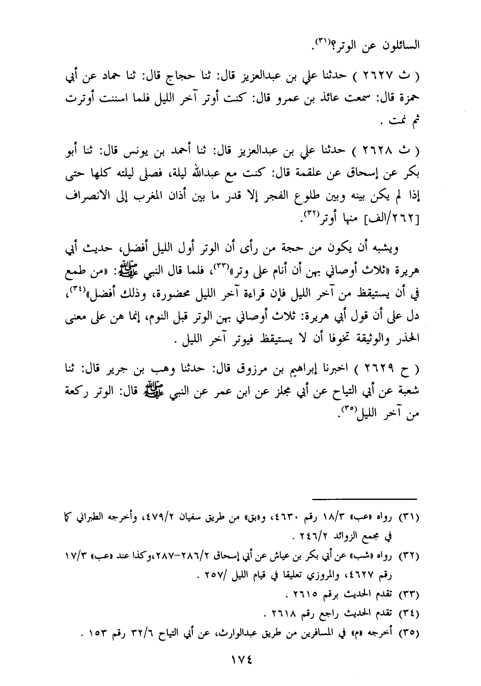 2628 - حَدَّثَنَا عَلِيُّ بْنُ عَبْدِ الْعَزِيزِ قَالَ: ثنا أَحْمَدُ بْنُ يُونُسَ قَالَ: ثنا أَبُو بَكْرٍ، عَنْ إِسْحَاقَ، عَنْ عَلْقَمَةَ قَالَ: كُنْتُ مَعَ عَبْدِ اللهِ لَيْلَةً فَصَلَّى لَيْلَتَهُ كُلَّهَا حَتَّى إِذَا لَمْ يَكُنْ بَيْنَهُ وَبَيْنَ طُلُوعِ الْفَجْرِ إِلَّا قَدْرُ مَا بَيْنَ أَذَانِ الْمَغْرِبِ إِلَى الِانْصِرَافِ مِنْهَا أَوْتَرَ " وَيُشْبِهُ أَنْ يَكُونَ مِنْ حُجَّةِ مَنْ رَأَى أَنْ الْوِتْرَ أَوَّلَ اللَّيْلِ أَفْضَلُ حَدِيثُ أَبِي هُرَيْرَةَ: ثَلَاثٌ أَوْصَانِي بِهِنَّ أَنْ أَنَامَ عَلَى وِتْرٍ، فَلَمَّا قَالَ النَّبِيُّ صَلَّى اللَّهُ عَلَيْهِ وَسَلَّمَ: «مَنْ طَمِعَ فِي أَنْ يَسْتَيْقِظَ مِنْ آخِرِ اللَّيْلِ فَإِنَّ قِرَاءَةَ آخِرِ اللَّيْلِ مَحْضُورَةٌ، وَذَلِكَ أَفْضَلُ» دَلَّ عَلَى أَنَّ قَوْلَ أَبِي هُرَيْرَةَ: ثَلَاثٌ أَوْصَانِي بِهِنَّ الْوِتْرُ قَبْلَ النَّوْمِ، إِنَّمَا هُنَّ عَلَى مَعْنَى الْحَذَرِ وَالْوَثيِقَةِ تَخَوُّفًا أَنْ لَا يَسْتَيْقِظَ فَيُوتِرَ آخِرَ اللَّيْلِ "