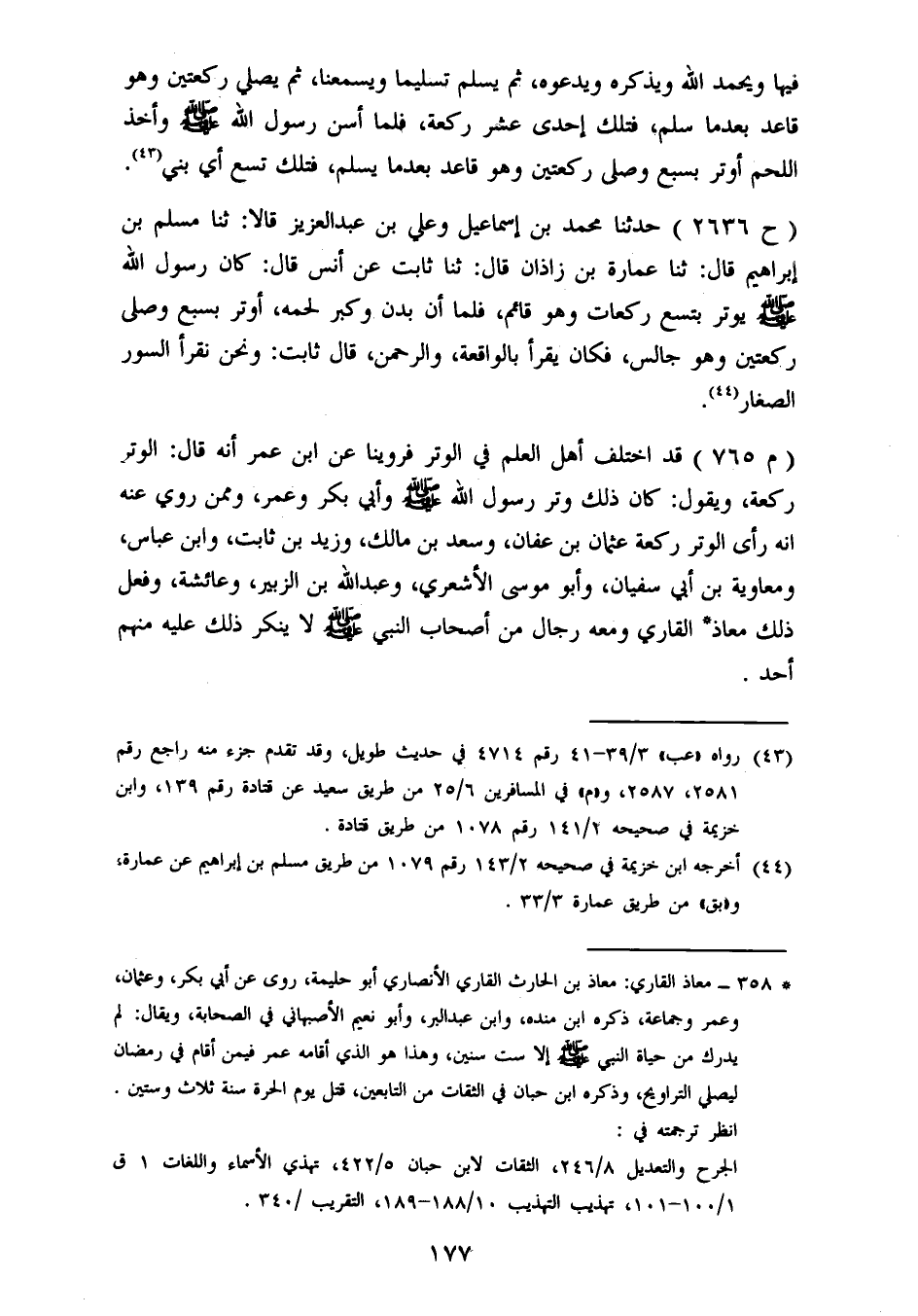 2636 - حَدَّثَنَا مُحَمَّدُ بْنُ إِسْمَاعِيلَ، وَعَلِيُّ بْنُ عَبْدِ الْعَزِيزِ، قَالَا: ثنا مُسْلِمُ بْنُ إِبْرَاهِيمَ، قَالَ: ثنا عُمَارَةُ بْنُ زَاذَانَ، قَالَ: ثنا ثَابِتٌ، عَنْ أَنَسٍ، قَالَ: كَانَ رَسُولُ اللهِ صَلَّى اللَّهُ عَلَيْهِ وَسَلَّمَ يُوتِرُ بِتِسْعِ رَكَعَاتٍ وَهُوَ قَائِمٌ فَلَمَّا أَنْ بَدَّنَ وَكَبِرَ لَحْمُهُ، أَوْتَرَ بِسَبْعٍ وَصَلَّى رَكْعَتَيْنِ وَهُوَ جَالِسٌ، فَكَانَ يَقْرَأُ بِالْوَاقِعَةِ، وَالرَّحْمَنِ " قَالَ ثَابِتٌ: «وَنَحْنُ نَقْرَأُ السُّوَرَ الصِّغَارَ» قَدِ اخْتَلَفَ أَهْلُ الْعِلْمِ فِي الْوِتْرِ فَرُوِّينَا عَنِ ابْنِ عُمَرَ أَنَّهُ قَالَ: الْوِتْرُ رَكْعَةٌ، وَيَقُولُ: كَانَ ذَلِكَ وِتْرَ رَسُولِ اللهِ صَلَّى اللَّهُ عَلَيْهِ وَسَلَّمَ، وَأَبِي بَكْرٍ، وَعُمَرَ، وَمِمَّنْ رُوِيَ عَنْهُ أَنَّهُ رَأَى الْوِتْرَ رَكْعَةً عُثْمَانُ بْنُ عَفَّانَ، وَسَعْدُ بْنُ مَالِكٍ، وَزَيْدُ بْنُ ثَابِتٍ، وَابْنُ عَبَّاسٍ، وَمُعَاوِيَةُ بْنُ أَبِي سُفْيَانَ، وَأَبُو مُوسَى الْأَشْعَرِيُّ، وَعَبْدُ اللهِ بْنُ الزُّبَيْرِ، وَعَائِشَةُ، وَفَعَلَ ذَلِكَ مُعَاذٌ الْقَارِّيُّ وَمَعَهُ رِجَالٌ مِنْ أَصْحَابِ النَّبِيِّ صَلَّى اللَّهُ عَلَيْهِ وَسَلَّمَ لَا يُنْكِرُ ذَلِكَ عَلَيْهِ مِنْهُمْ أَحَدٌ