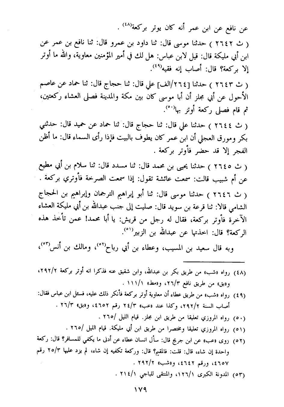 2646 - حَدَّثَنَا مُوسَى قَالَ: ثنا أَبُو إِبْرَاهِيمَ التُّرْجُمَانُ، وَإِبْرَاهِيمُ بْنُ الْحَجَّاجِ السَّامِيُّ قَالَا: ثنا قزعة بْنُ سُوَيْدٍ قَالَ: صَلَّيْتُ إِلَى جَنْبِ عَبْدِ اللهِ بْنِ أَبِي مُلَيْكَةَ الْعِشَاءَ الْآخِرَةَ فَأَوْتَرَ بِرَكْعَةٍ، فَقَالَ لَهُ رَجُلٌ مِنْ قُرَيْشٍ: يَا أَبَا مُحَمَّدٍ، عَمَّنْ تَأْخُذُ هَذِهِ الرَّكْعَةَ؟ قَالَ: «أَخَذْتُهَا عَنْ عَبْدِ اللهِ بْنِ الزُّبَيْرِ» وَبِهِ قَالَ سَعِيدُ بْنُ الْمُسَيِّبِ، وَعَطَاءُ بْنُ أَبِي رَبَاحٍ، وَمَالِكُ بْنُ أَنَسٍ، -[180]- وَالْأَوْزَاعِيُّ، وَالشَّافِعِيُّ، وَأَحْمَدُ وَإِسْحَاقُ، وَأَبُو ثَوْرٍ غَيْرَ أَنَّ مَالِكًا، وَالْأَوْزَاعِيَّ، وَالشَّافِعِيَّ، وَأَحْمَدَ، وَإِسْحَاقَ رَأَوْا أَنْ يُصَلِّيَ رَكْعَتَيْنِ، ثُمَّ يُسَلِّمَ، ثُمَّ يُوتِرَ رَكْعَةً وَقَالَتْ طَائِفَةٌ: يُوتِرُ بِثَلَاثٍ، وَمِمَّنْ رُوِيَ عَنْهُ ذَلِكَ عُمَرُ بْنُ الْخَطَّابِ، وَعَلِيُّ بْنُ أَبِي طَالِبٍ، وَأُبَيُّ بْنُ كَعْبٍ، وَأَنَسُ بْنُ مَالِكٍ، وَابْنُ عَبَّاسٍ، وَابْنُ مَسْعُودٍ، وَأَبُو أُمَامَةَ، وَعُمَرُ بْنُ عَبْدِ الْعَزِيزِ