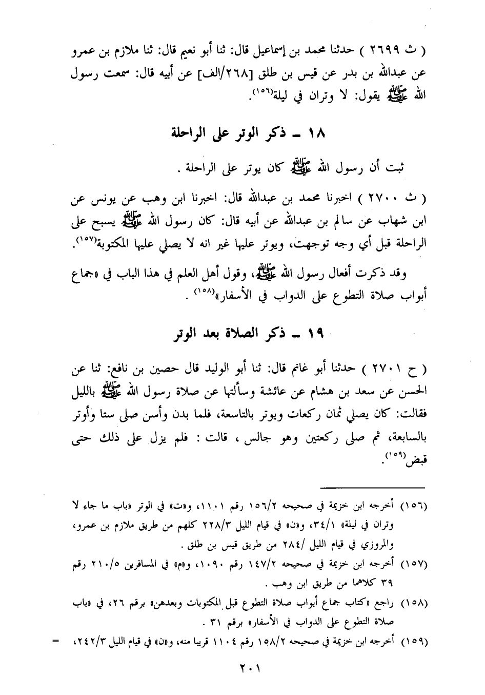ذِكْرُ الْوِتْرِ عَلَى الرَّاحِلَةِ ثَبَتَ «أَنَّ رَسُولَ اللهِ صَلَّى اللَّهُ عَلَيْهِ وَسَلَّمَ كَانَ يُوتِرُ عَلَى الرَّاحِلَةِ»