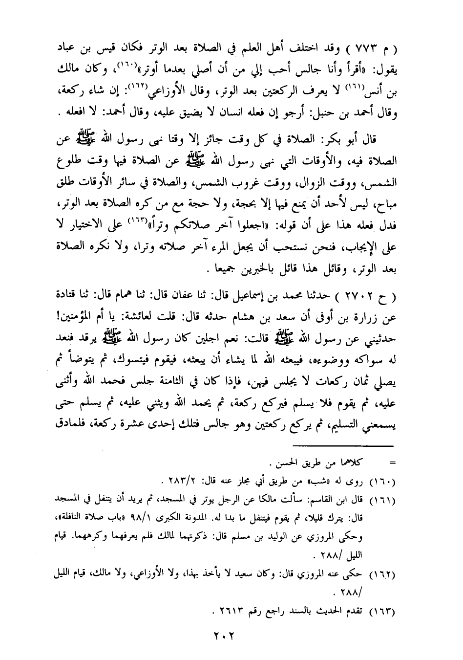 2702 - حَدَّثَنَا مُحَمَّدُ بْنُ إِسْمَاعِيلَ، قَالَ: ثنا عَفَّانُ، قَالَ: ثنا هَمَّامٌ، قَالَ: ثنا قَتَادَةُ، عَنْ زُرَارَةَ بْنِ أَوْفَى، أَنَّ سَعْدَ بْنَ هِشَامٍ، حَدَّثهُ قَالَ: قُلْتُ لِعَائِشَةَ: يَا أُمَّ الْمُؤْمِنِينَ، حَدِّثينِي عَنْ رَسُولِ اللهِ صَلَّى اللَّهُ عَلَيْهِ وَسَلَّمَ قَالَتْ: " نَعَمْ أُجْلِيَنَّ كَانَ رَسُولُ اللهِ صَلَّى اللَّهُ عَلَيْهِ وَسَلَّمَ يَرْقُدُ فَنَعُدُّ لَهُ سِوَاكَهُ وَوُضُوءَهُ، فَيَبْعَثهُ اللهُ لِمَا يَشَاءُ أَنْ يَبْعَثهُ، فَيَقُومَ فَيَتَسَوَّكَ، ثُمَّ يَتَوَضَّأَ، ثُمَّ يُصَلِّيَ ثَمَانِ رَكَعَاتٍ لَا يَجْلِسُ فِيهِنَّ، فَإِذَا كَانَ فِي الثامِنَةِ جَلَسَ فَحَمِدَ اللهَ، وَأَثْنَى عَلَيْهِ، ثُمَّ يَقُومُ فَلَا يُسَلِّمُ فَيَرْكَعُ رَكْعَةً، ثُمَّ يَحْمَدُ اللهَ وَيُثنِي عَلَيْهِ، ثُمَّ يُسَلِّمُ حَتَّى يُسْمِعُنِي التَّسْلِيمَ، ثُمَّ يَرْكَعُ رَكْعَتَيْنِ وَهُوَ جَالِسٌ فَتِلْكَ إِحْدَى عَشْرَةَ رَكْعَةً، فَلَمَّا دَقَّ -[203]- وَأَسَنَّ وَكَثرَ لَحْمُهُ، صَلَّى سَبْعَ رَكَعَاتٍ قَالَ: فَكَانَ رَسُولُ اللهِ صَلَّى اللَّهُ عَلَيْهِ وَسَلَّمَ إِذَا صَلَّى صَلَاةً دَاوَمَ عَلَيْهَا، قَالَتْ: وَكَانَ إِذَا فَاتَهُ الْقِيَامُ مِنَ اللَّيْلِ صَلَّى ثِنْتَيْ عَشْرَةَ رَكْعَةٍ قَبْلَ النَّهَارِ " قَالَ أَبُو بَكْرٍ: فِي هَذَا الْحَدِيثِ سُنَنٌ مَذْكُورَةٌ فِي مَوَاضِعِهَا، وَفِيهِ دَلِيلٌ عَلَى أَنَّ الْوِتْرَ لَا يُقْضَى بِالنَّهَارِ، وَلِأَنَّهَا لَمَّا خَبَّرَتْ بِصَلَاتِهِ بِاللَّيْلِ وَبِوِتْرِهِ، ثُمَّ خَبَّرَتْ لَمَّا وَصَفَتْ مَا كَانَ يَفْعَلُ إِذَا فَاتَهُ قِيَامُ اللَّيْلِ وَلَمْ تَذْكُرْ قَضَاءَ الْوِتْرِ، دَلَّ عَلَى أَنَّ الْوِتْرَ إِذَا فَاتَ وَقْتُهُ لَمْ يُقْضَ