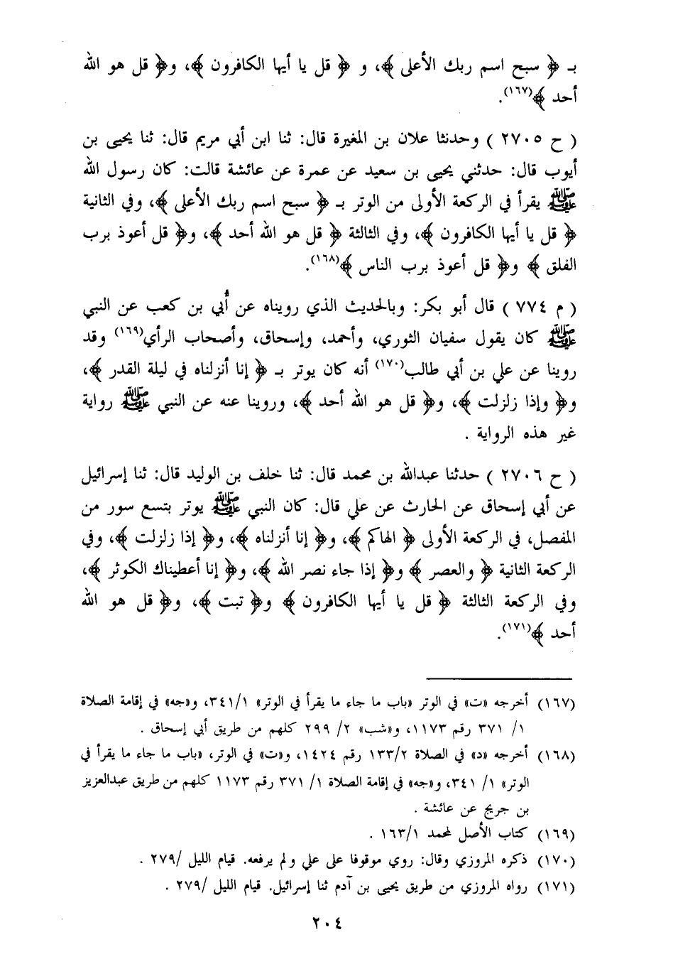 2705 - وَحَدَّثنَا عَلَّانُ بْنُ الْمُغِيرَةَ، قَالَ: ثنا ابْنُ أَبِي مَرْيَمَ، قَالَ: ثنا يَحْيَى بْنُ أَيُّوبَ، قَالَ: حَدَّثَنِي يَحْيَى بْنُ سَعِيدٍ، عَنْ عَمْرَةَ، عَنْ عَائِشَةَ، قَالَتْ: «كَانَ رَسُولُ اللهِ صَلَّى اللَّهُ عَلَيْهِ وَسَلَّمَ يَقْرَأُ فِي الرَّكْعَةِ الْأُولَى مِنَ الْوِتْرِ بِسَبِّحِ اسْمَ رَبِّكَ الْأَعْلَى وَفي الثَّانِيَةِ قُلْ يَا أَيُّهَا الْكَافِرُونَ، وَفي الثَّالِثَةِ قُلْ هُوَ اللهُ أَحَدٌ، وَقُلْ أَعُوذُ بِرَبِّ الْفَلَقِ وَقُلْ أَعُوذُ بِرَبِّ النَّاسِ» قَالَ أَبُو بَكْرٍ: وَبِالْحَدِيثِ الَّذِي رُوِّينَاهُ عَنْ أُبَيِّ بْنِ كَعْبٍ، عَنِ النَّبِيِّ صَلَّى اللَّهُ عَلَيْهِ وَسَلَّمَ كَانَ يَقُولُ سُفْيَانُ الثَّوْرِيُّ، وَأَحْمَدُ، وَإِسْحَاقُ , وَأَصْحَابُ الرَّأْيِ، وَقَدْ رُوِّينَا عَنْ عَلِيِّ بْنِ أَبِي طَالِبٍ أَنَّهُ كَانَ يُوتِرِ بِإِنَّا أَنْزَلْنَاهُ فِي لَيْلَةِ الْقَدْرِ وَإِذَا زُلْزِلَتْ، وَقُلْ هُوَ اللهُ أَحَدٌ، وَرُوِّينَا عَنْهُ، عَنِ النَّبِيِّ صَلَّى اللَّهُ عَلَيْهِ وَسَلَّمَ رِوَايَةً غَيْرَ هَذِهِ الرِّوَايَةِ
