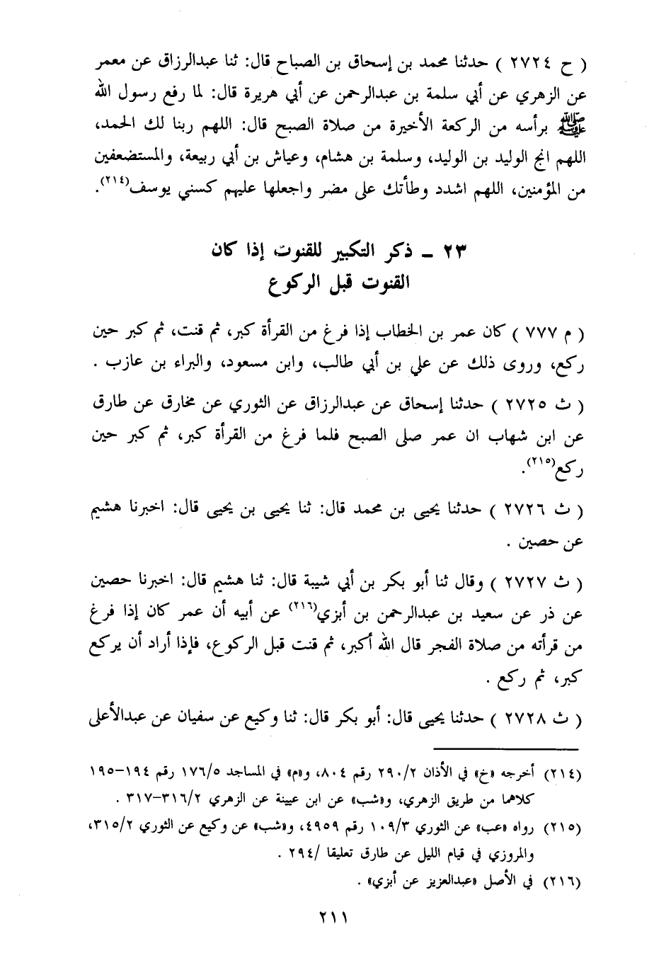 2728 - حَدَّثَنَا يَحْيَى قَالَ: أَبُو بَكْرٍ قَالَ: ثنا وَكِيعٌ، عَنْ سُفْيَانَ، عَنْ عَبْدِ الْأَعْلَى، -[212]- عَنْ أَبِي عَبْدِ الرَّحْمَنِ السُّلَمِيِّ أَنَّ عَلِيًّا «كَبَّرَ حِينَ قَنَتَ فِي الْفَجْرِ، وَكَبَّرَ حِينَ رَكَعَ»