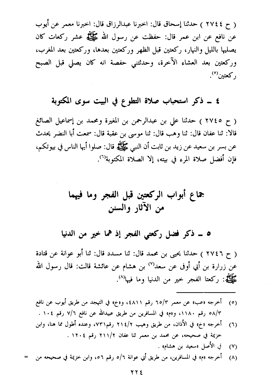 2744 - حَدَّثَنَا إِسْحَاقُ، قَالَ: أَخْبَرَنَا عَبْدُ الرَّزَّاقِ، قَالَ: أَخْبَرَنَا مَعْمَرٌ عَنْ أَيُّوبَ، عَنْ نَافِعٍ، عَنِ ابْنِ عُمَرَ، قَالَ: «حَفِظْتُ عَنْ رَسُولِ اللهِ صَلَّى اللَّهُ عَلَيْهِ وَسَلَّمَ عَشْرَ رَكَعَاتٍ كَانَ يُصَلِّيَهَا بِاللَّيْلِ وَالنَّهَارِ، رَكْعَتَيْنِ قَبْلَ الظُّهْرِ , وَرَكْعَتَيْنِ بَعْدَهَا، وَرَكْعَتَيْنِ بَعْدَ الْمَغْرِبِ، وَرَكْعَتَيْنِ بَعْدَ الْعِشَاءِ الْآخِرَةِ، وَحَدَّثَتْنِي حَفْصَةُ أَنَّهُ كَانَ يُصَلِّي قَبْلَ الصُّبْحِ رَكْعَتَيْنِ»