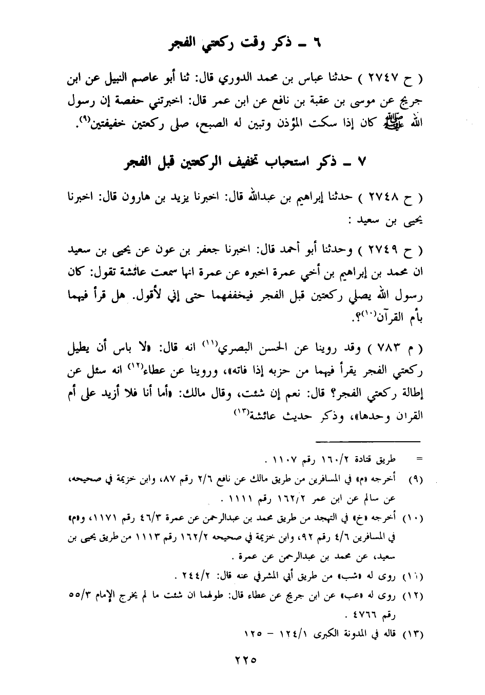 2749 - وَحَدَّثَنَا أَبُو أَحْمَدَ، قَالَ: أَخْبَرَنَا جَعْفَرُ بْنُ عَوْنٍ، عَنْ يَحْيَى بْنِ سَعِيدٍ، أَنَّ مُحَمَّدَ بْنَ إِبْرَاهِيمَ ابْنَ أَخِي عَمْرَةَ أَخْبَرَهُ، عَنْ عَمْرَةَ، أَنَّهَا سَمِعَتْ عَائِشَةَ، تَقُولُ: كَانَ رَسُولُ اللهِ يُصَلِّي رَكْعَتَيْنِ قَبْلَ الْفَجْرِ فَيُخَفِّفُهُمَا , حَتَّى إِنِّي لَأَقُولُ: هَلْ قَرَأَ فِيهِمَا بِأُمِّ الْقُرْآنِ " وَقَدْ رُوِّينَا عَنِ الْحَسَنِ الْبَصْرِيِّ، أَنَّهُ قَالَ: «لَا بَأْسَ أَنْ يُطِيلَ رَكْعَتَيِ الْفَجْرِ , يَقْرَأُ فِيهِمَا مِنْ حِزْبِهِ إِذَا فَاتَهُ» وَرُوِّينَا، عَنْ عَطَاءٍ أَنَّهُ سُئِلَ، عَنْ إِطَالَةِ رَكْعَتَيِ الْفَجْرِ؟ قَالَ: نَعَمْ , إِنْ شِئْتَ، وَقَالَ مَالِكٌ: «أَمَّا أَنَا , فَلَا أَزِيدُ عَلَى أُمِّ الْقُرْآنِ وَحْدَهَا» ، وَذَكَرَ حَدِيثَ عَائِشَةَ. -[226]- قَالَ أَبُو بَكْرٍ: أَمَّا الِاقْتِصَارُ عَلَى قِرَاءَةِ الْقُرْآنِ فَلَا أَحْسِبُهُ، وَلَا إِعَادَةَ عَلَى مَنْ فَعَلَ ذَلِكَ، وَأُحِبُّ أَنْ يَقْرَأَ فِيهِمَا، رُوِّينَا أَنَّ النَّبِيَّ صَلَّى اللَّهُ عَلَيْهِ وَسَلَّمَ كَانَ يَقْرَأُ بِهِ، وَيُخَفِّفُهُمَا أَحَبُّ إِلَيَّ لِاتِّبَاعِ السُّنَّةِ