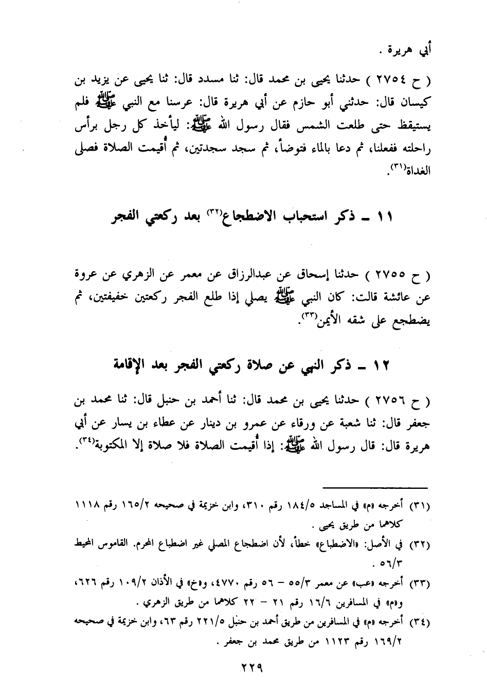 2754 - حَدَّثَنَا يَحْيَى بْنُ مُحَمَّدٍ، قَالَ: ثنا مُسَدَّدٌ، قَالَ: ثنا يَحْيَى، عَنْ يَزِيدَ بْنِ كَيْسَانَ، قَالَ: حَدَّثَنِي أَبُو حَازِمٍ، عَنْ أَبِي هُرَيْرَةَ، قَالَ: عَرَّسْنَا مَعَ النَّبِيِّ صَلَّى اللَّهُ عَلَيْهِ وَسَلَّمَ , فَلَمْ يَسْتَيْقِظْ حَتَّى طَلَعَتِ الشَّمْسُ , فَقَالَ رَسُولُ اللهِ صَلَّى اللَّهُ عَلَيْهِ وَسَلَّمَ: «لِيَأْخُذْ كُلُّ رَجُلٍ بِرَأْسِ رَاحِلَتِهِ» فَفَعَلْنَا، ثُمَّ دَعَا بِالْمَاءِ فَتَوَضَّأَ، ثُمَّ سَجَدَ سَجْدَتَيْنِ، ثُمَّ أُقِيمَتِ الصَّلَاةُ , فَصَلَّى الْغَدَاةَ "