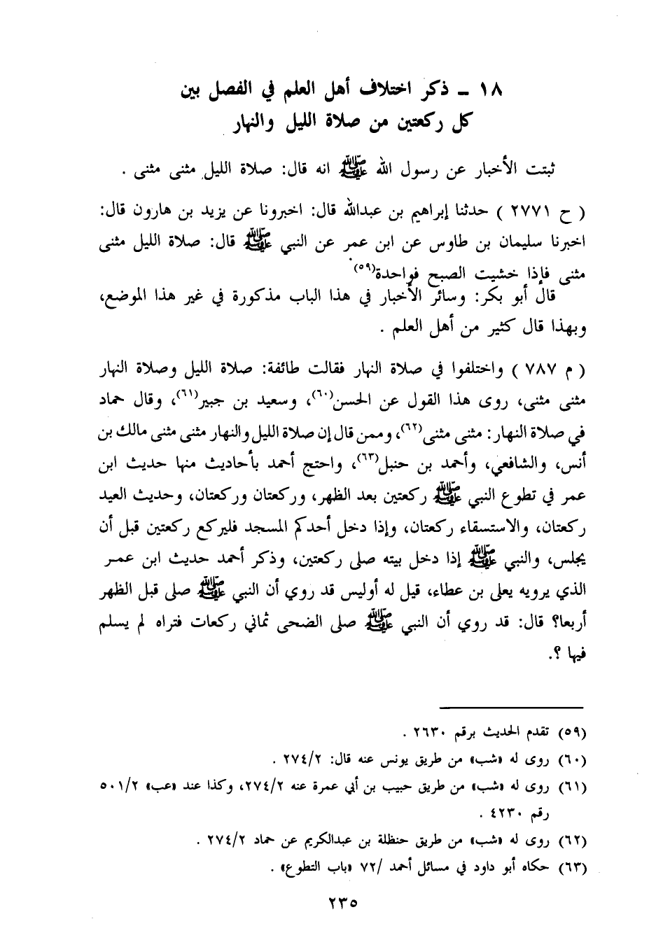 2771 - حَدَّثَنَا إِبْرَاهِيمُ بْنُ عَبْدِ اللهِ، قَالَ: أَخْبَرُونَا، عَنْ يَزِيدَ بْنِ هَارُونَ، قَالَ: أَخْبَرَنَا سُلَيْمَانُ عَنْ طَاوُسٍ، عَنِ ابْنِ عُمَرَ، عَنِ النَّبِيِّ صَلَّى اللَّهُ عَلَيْهِ وَسَلَّمَ قَالَ: «صَلَاةُ اللَّيْلِ مَثْنَى مَثْنَى , فَإِذَا خَشِيتَ الصُّبْحَ فَوَاحِدَةً» قَالَ أَبُو بَكْرٍ: وَسَائِرُ الْأَخْبَارِ فِي هَذَا الْبَابِ مَذْكُورَةٌ فِي غَيْرِ هَذَا الْمَوْضِعِ، وَبِهَذَا قَالَ كَثِيرٌ مِنْ أَهْلِ الْعِلْمِ وَاخْتَلَفُوا فِي صَلَاةِ النَّهَارِ فَقَالَتْ طَائِفَةٌ: «صَلَاةُ اللَّيْلِ وَصَلَاةُ النَّهَارِ مَثْنَى مَثْنَى» رُوِيَ هَذَا الْقَوْلُ، عَنِ الْحَسَنِ، وَسَعِيدِ بْنِ جُبَيْرٍ، وَقَالَ حَمَّادٌ فِي صَلَاةِ النَّهَارِ: مَثْنَى مَثْنَى، وَمِمَّنْ قَالَ إِنَّ صَلَاةَ اللَّيْلِ وَالنَّهَارِ مَثْنَى مَثْنَى: مَالِكُ بْنُ أَنَسٍ، وَالشَّافِعِيُّ، وَأَحْمَدُ بْنُ حَنْبَلٍ، وَاحْتَجَّ أَحْمَدُ بِأَحَادِيثَ , مِنْهَا حَدِيثُ ابْنِ عُمَرَ فِي تَطَوُّعِ النَّبِيِّ صَلَّى اللَّهُ عَلَيْهِ وَسَلَّمَ رَكْعَتَيْنِ بَعْدَ الظُّهْرِ، وَرَكْعَتَانِ وَرَكْعَتَانِ، وَحَدِيثُ: «الْعِيدُ رَكْعَتَانِ، وَالِاسْتِسْقَاءُ رَكْعَتَانِ» ، «وَإِذَا دَخَلَ أَحَدُكُمُ الْمَسْجِدَ فَلْيَرْكَعْ رَكْعَتَيْنِ قَبْلَ أَنْ يَجْلِسَ» , وَالنَّبِيُّ صَلَّى اللَّهُ عَلَيْهِ وَسَلَّمَ إِذَا دَخَلَ بَيْتَهُ صَلَّى رَكْعَتَيْنِ. وَذَكَرَ أَحْمَدُ حَدِيثَ ابْنِ عُمَرَ الَّذِي يَرْوِيهِ يَعْلَى بْنُ عَطَاءٍ، قِيلَ لَهُ: أَوَ لَيْسَ قَدْ رُوِيَ أَنَّ النَّبِيَّ صَلَّى اللَّهُ عَلَيْهِ وَسَلَّمَ صَلَّى قَبْلَ الظُّهْرِ أَرْبَعًا؟ قَالَ: قَدْ رُوِيَ أَنَّ النَّبِيَّ صَلَّى اللَّهُ عَلَيْهِ وَسَلَّمَ صَلَّى الضُّحَى ثَمَانِيَ رَكَعَاتٍ , فَتَرَاهُ لَمْ يُسَلِّمْ فِيهَا؟ -[236]- وَفِيهِ قَوْلٌ ثَانٍ: وَهُوَ أَنَّ صَلَاةَ اللَّيْلِ مَثْنَى مَثْنَى وَبِالنَّهَارِ أَرْبَعًا , ثَابِتٌ عَنِ ابْنِ عُمَرَ أَنَّهُ كَانَ يَفْعَلُ ذَلِكَ