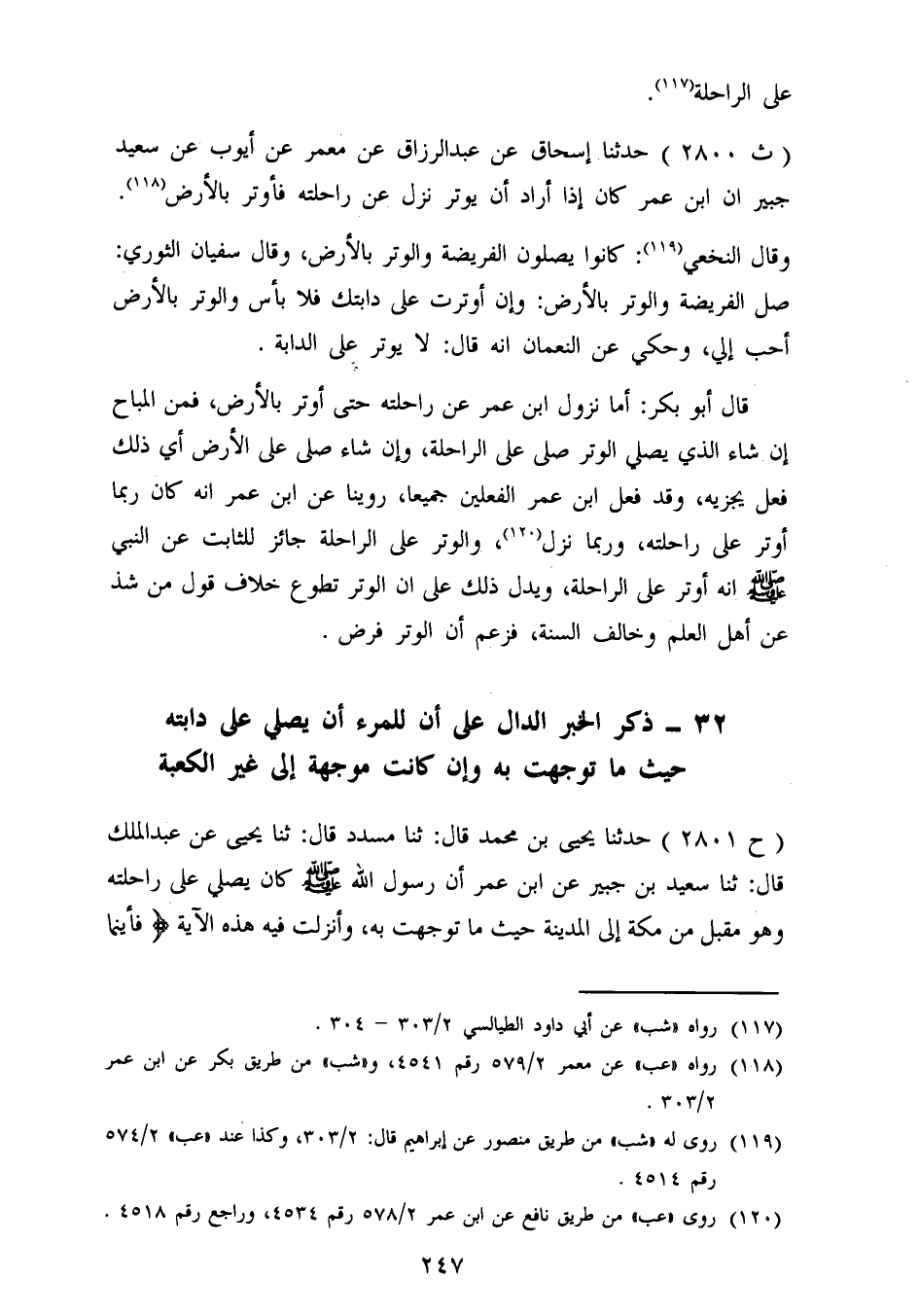 2800 - حَدَّثَنَا إِسْحَاقُ، عَنْ عَبْدِ الرَّزَّاقِ، عَنْ مَعْمَرٍ، عَنْ أَيُّوبَ، عَنْ سَعِيدِ بْنِ جُبَيْرٍ، أَنَّ ابْنَ عُمَرَ، كَانَ إِذَا أَرَادَ أَنْ يُوتِرَ، نَزَلَ عَنْ رَاحِلَتِهِ , فَأَوْتَرَ بِالْأَرْضِ " وَقَالَ النَّخَعِيُّ: «كَانُوا يُصَلُّونَ الْفَرِيضَةَ وَالْوِتْرَ بِالْأَرْضِ» ، وَقَالَ سُفْيَانُ الثَّوْرِيُّ: «صَلِّ الْفَرِيضَةَ وَالْوِتْرَ بِالْأَرْضِ , وَإِنْ أَوْتَرْتَ عَلَى دَابَّتِكَ فَلَا بَأْسَ , وَالْوِتْرُ بِالْأَرْضِ أَحَبُّ إِلَيَّ» وَحُكِيَ عَنِ النُّعْمَانِ أَنَّهُ قَالَ: «لَا يُوتَرُ عَلَى الدَّابَّةِ» . قَالَ أَبُو بَكْرٍ: أَمَا نُزُولُ ابْنِ عُمَرَ عَنْ رَاحِلَتِهِ حَتَّى أَوْتَرَ بِالْأَرْضِ، فَمِنَ الْمُبَاحِ , إِنْ شَاءَ الَّذِي يُصَلِّي الْوِتْرَ صَلَّى عَلَى الرَّاحِلَةِ، وَإِنْ شَاءَ صَلَّى عَلَى الْأَرْضِ , أَيَّ ذَلِكَ فَعَلَ يُجْزِيهِ. وَقَدْ فَعَلَ ابْنُ عُمَرَ الْفِعْلَيْنِ جَمِيعًا: رُوِّينَا، عَنِ ابْنِ عُمَرَ أَنَّهُ كَانَ رُبَّمَا أَوْتَرَ عَلَى رَاحِلَتِهِ، وَرُبَّمَا نَزَلَ. وَالْوِتْرُ عَلَى الرَّاحِلَةِ جَائِزٌ , لِلثَّابِتِ عَنِ النَّبِيِّ صَلَّى اللَّهُ عَلَيْهِ وَسَلَّمَ , أَنَّهُ أَوْتَرَ عَلَى الرَّاحِلَةِ، وَيَدُلُّ ذَلِكَ عَلَى أَنَّ الْوِتْرَ تَطَوُّعٌ , خِلَافَ قَوْلِ مَنْ شَذَّ عَنْ أَهْلِ الْعِلْمِ , وَخَالَفَ السُّنَّةَ، فَزَعَمَ أَنَّ الْوِتْرَ فَرْضٌ