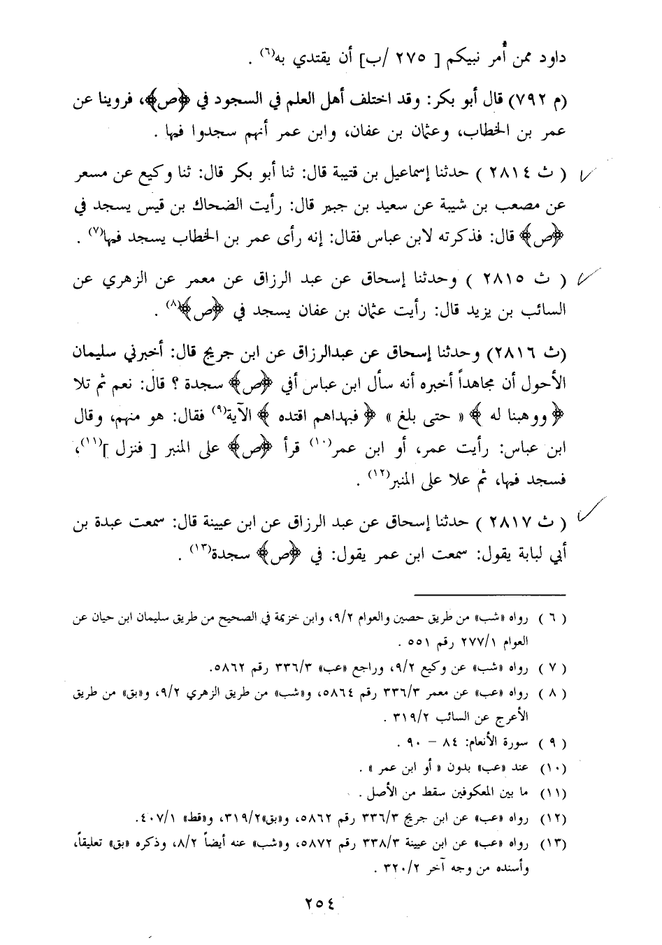 2816 - وَحَدَّثَنَا إِسْحَاقُ، عَنْ عَبْدِ الرَّزَّاقِ، عَنِ ابْنِ جُرَيْجٍ، قَالَ: أَخْبَرَنِي سُلَيْمَانُ الْأَحْوَلُ، أَنَّ مُجَاهِدًا، أَخْبَرَهُ أَنَّهُ، سَأَلَ ابْنَ عَبَّاسٍ: «أَفِي ص سَجْدَةٌ؟» قَالَ: نَعَمْ , ثُمَّ تَلَا {وَوَهَبْنَا لَهُ} [الأنعام: 84] حَتَّى بَلَغَ: {فَبِهُدَاهُمُ اقْتَدِهْ} [الأنعام: 90] الْآيَةَ , فَقَالَ: «هُوَ مِنْهُمْ» ، وَقَالَ ابْنُ عَبَّاسٍ: رَأَيْتُ عُمَرَ، أَوِ ابْنَ عُمَرَ قَرَأَ ص عَلَى الْمِنْبَرِ , فَنَزَلَ، فَسَجَدَ فِيهَا، ثُمَّ عَلَا عَلَى الْمِنْبَرِ "