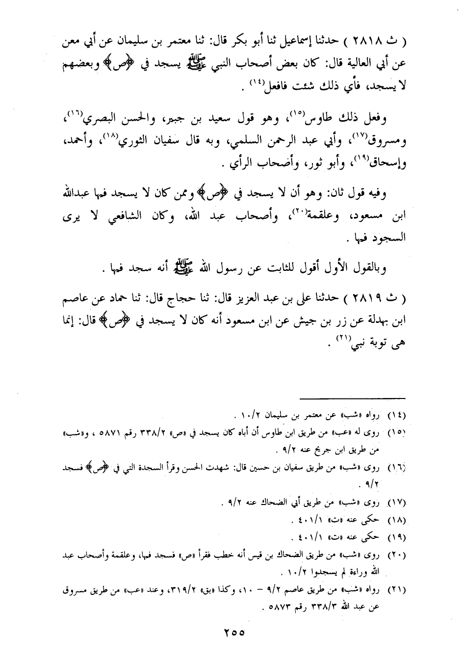 2818 - حَدَّثَنَا إِسْمَاعِيلُ، ثنا أَبُو بَكْرٍ، قَالَ: ثنا مُعْتَمِرُ بْنُ سُلَيْمَانَ، عَنْ أَبِي مَعْنٍ، عَنْ أَبِي الْعَالِيَةِ، قَالَ: «كَانَ بَعْضُ أَصْحَابِ النَّبِيِّ صَلَّى اللَّهُ عَلَيْهِ وَسَلَّمَ يَسْجُدُ فِي ص , وَبَعْضُهُمْ لَا يَسْجُدُ، فَأَيُّ ذَلِكَ شِئْتَ , فَافْعَلْ» وَفَعَلَ ذَلِكَ طَاوُسٌ، وَهُوَ قَوْلُ سَعِيدِ بْنِ جُبَيْرٍ، وَالْحَسَنِ الْبَصْرِيِّ، وَمَسْرُوقٍ، وَأَبِي عَبْدِ الرَّحْمَنِ السُّلَمِيِّ، وَبِهِ قَالَ سُفْيَانُ الثَّوْرِيُّ، وَأَحْمَدُ، وَإِسْحَاقُ، وَأَبُو ثَوْرٍ، وَأَصْحَابُ الرَّأْيِ. وَفِيهِ قَوْلٌ ثَانٍ: وَهُوَ أَنْ لَا يَسْجُدَ فِي ص وَمِمَّنْ كَانَ لَا يَسْجُدُ فِيهَا: عَبْدُ اللهِ بْنُ مَسْعُودٍ، وَعَلْقَمَةُ، وَأَصْحَابُ عَبْدِ اللهِ، وَكَانَ الشَّافِعِيُّ لَا يَرَى السُّجُودَ فِيهَا. وَبِالْقَوْلِ الْأَوَّلِ أَقُولُ , لِلثَّابِتِ عَنْ رَسُولِ اللهِ صَلَّى اللَّهُ عَلَيْهِ وَسَلَّمَ أَنَّهُ سَجَدَ فِيهَا