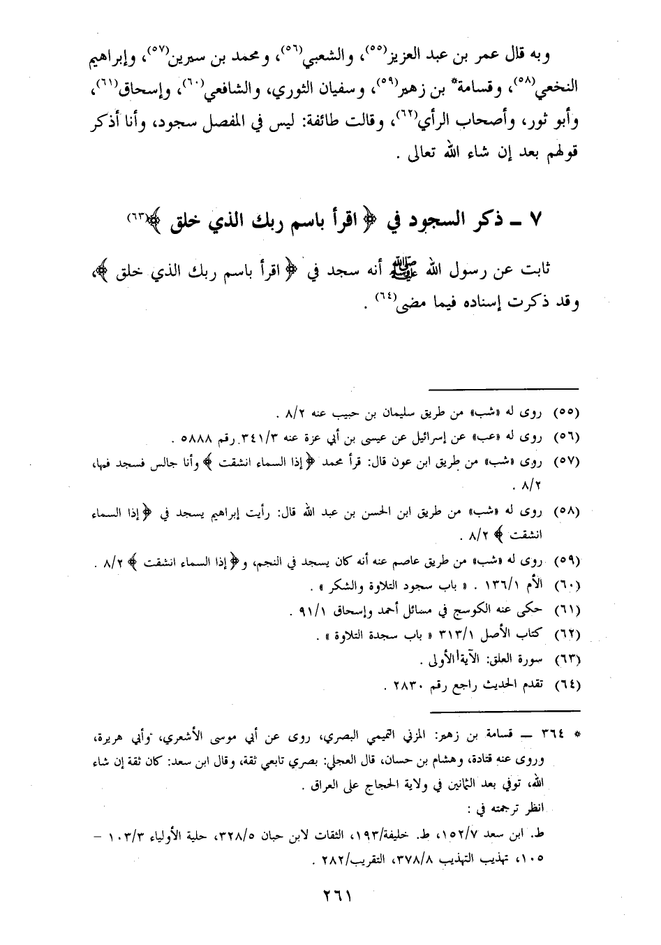 ذِكْرُ السُّجُودِ فِي اقْرَأْ بِاسْمِ رَبِّكَ الَّذِي خَلَقَ ثَابِتٌ عَنْ رَسُولِ اللهِ صَلَّى اللَّهُ عَلَيْهِ وَسَلَّمَ أَنَّهُ سَجَدَ فِي اقْرَأْ بِاسْمِ رَبِّكَ الَّذِي خَلَقَ وَقَدْ ذَكَرْتُ إِسْنَادَهُ فِيمَا مَضَى. -[262]- وَقَدِ اخْتَلَفَ أَهْلُ الْعِلْمِ فِي السُّجُودِ فِي اقْرَأْ بِاسْمِ رَبِّكَ الَّذِي خَلَقَ، فَكَانَ عَلِيُّ بْنُ أَبِي طَالِبٍ، وَعَبْدُ اللهِ بْنُ مَسْعُودٍ، يَقُولَانِ: عَزَائِمُ السُّجُودِ. فَذَكَرَا مِنْهَا اقْرَأْ بِاسْمِ رَبِّكَ الَّذِي خَلَقَ، فَلَمْ يَسْجُدْ فِيهَا , فَلَا عَلَيْهِ أَنْ يَقْرَأْهَا
