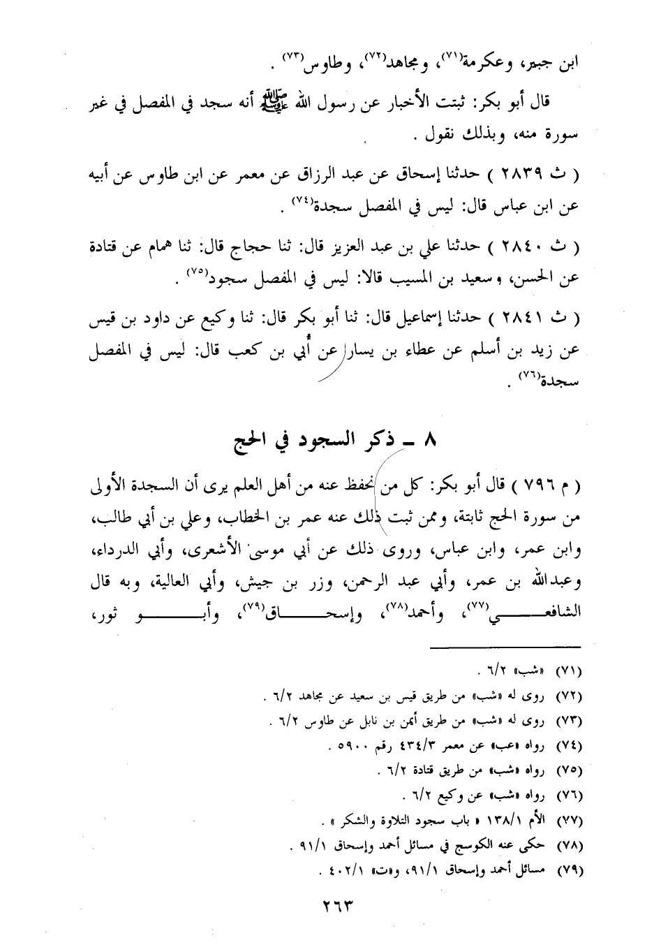 2839 - حَدَّثَنَا إِسْحَاقُ، عَنْ عَبْدِ الرَّزَّاقِ، عَنْ مَعْمَرٍ، عَنِ ابْنِ طَاوُسٍ، عَنْ أَبِيهِ، عَنِ ابْنِ عَبَّاسٍ، قَالَ: «لَيْسَ فِي الْمُفَصَّلِ سَجْدَةٌ»