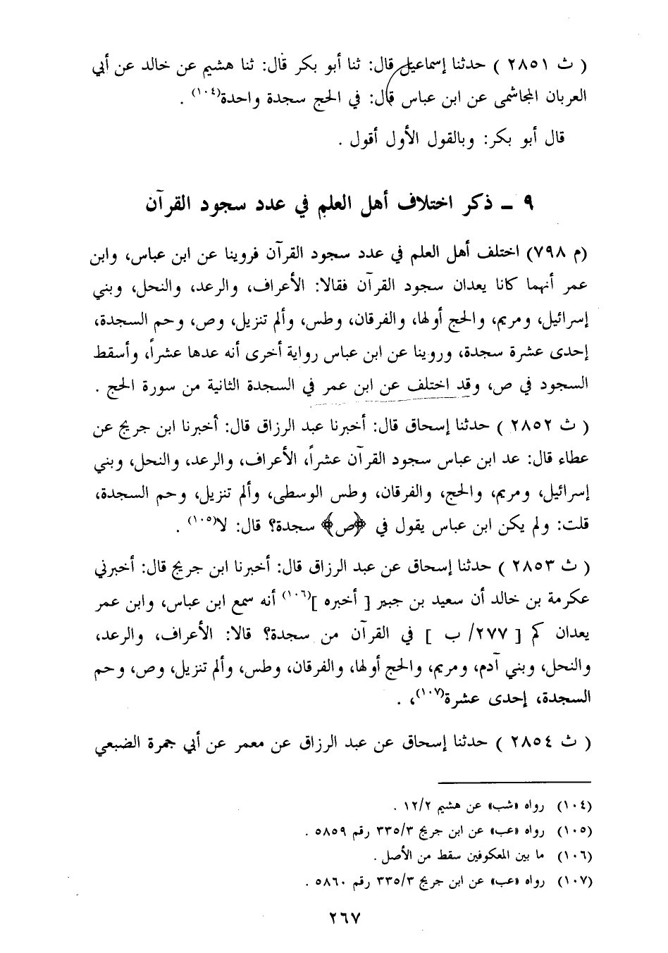 2854 - حَدَّثَنَا إِسْحَاقُ، عَنْ عَبْدِ الرَّزَّاقِ، عَنْ مَعْمَرٍ، عَنْ أَبِي جَمْرَةَ الضُّبَعِيِّ، -[268]- قَالَ سَمِعْتُ ابْنَ عَبَّاسٍ، يَقُولُ: «فِي الْقُرْآنِ إِحْدَى عَشْرَةَ سَجْدَةً , فَعَدَّهُنَّ» كَمَا ذَكَرَ ابْنُ جُرَيْجٍ , عَنْ عِكْرِمَةَ , عَنْ سَعِيدِ بْنِ جُبَيْرٍ وَقَالَتْ طَائِفَةٌ: سُجُودُ الْقُرْآنِ أَرْبَعَ عَشْرَةَ سَجْدَةً , فِي الْحَجِّ مِنْهَا سَجْدَتَانِ، وَفِي الْمُفَصَّلِ ثَلَاثَةٌ، وَلَيْسَ فِي ص مِنْهَا شَيْءٌ , هَكَذَا قَالَ الشَّافِعِيُّ، وَقَالَ أَبُو ثَوْرٍ كَقَوْلِ الشَّافِعِيِّ فِي الْعَدَدِ، غَيْرَ أَنَّهُ أَثْبَتَ السُّجُودَ فِي ص وَأَسْقَطَ السُّجُودَ مِنْ سُورَةِ النَّجْمِ، وَخَالَفَ الشَّافِعِيَّ فِي هَاتَيْنِ السَّجْدَتَيْنِ. وَقَالَ إِسْحَاقُ فِي سُجُودِ الْقُرْآنِ خَمْسَ عَشْرَةَ: الْأَعْرَافَ، وَالرَّعْدَ، وَالنَّحْلَ، وَبَنِي إِسْرَائِيلَ، وَمَرْيَمَ، وَفِي الْحَجِّ سَجْدَتَانِ مُبَارَكَتَانِ، وَفِي الْفُرْقَانِ، وَالنَّمْلِ، وَالم تَنْزِيلُ السَّجْدَةَ , وَفِي ص، وَفِي حم السَّجْدَةِ، وَفِي النَّجْمِ، وَفِي إِذَا السَّمَاءُ انْشَقَّتْ، وَاقْرَأْ بِاسْمِ رَبِّكَ الَّذِي خَلَقَ، وَقَالَ أَصْحَابُ الرَّأْيِ كَمَا قَالَ إِسْحَاقُ , إِلَّا فِي السُّجُودِ فِي سُورَةِ الْحَجِّ , فَإِنَّهُمْ قَالُوا: فِيهَا سَجْدَةٌ وَاحِدَةٌ، وَقَوْلُهُمْ كَقَوْلِهِ فِي سَائِرِ سُجُودِ الْقُرْآنِ