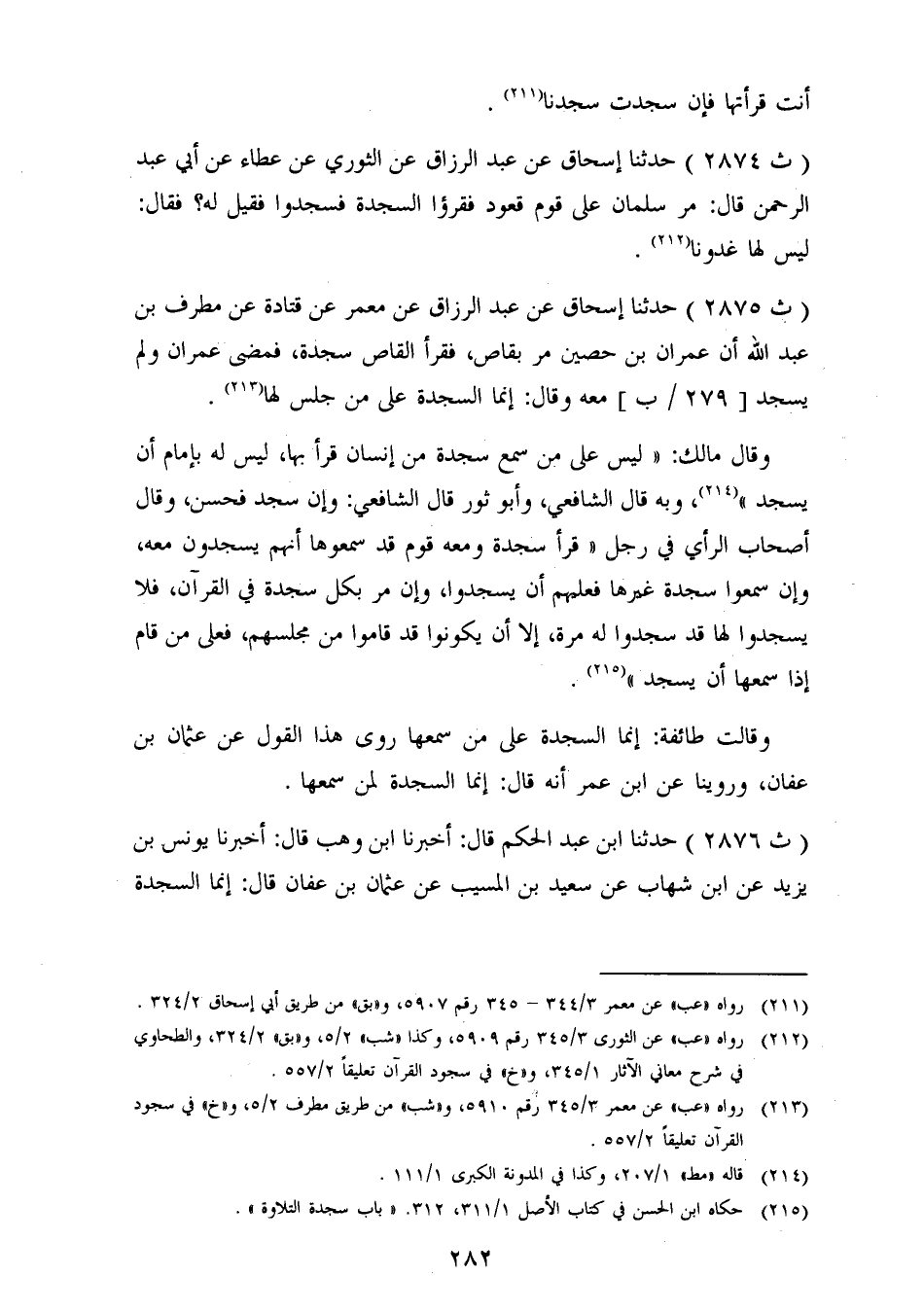 2875 - حَدَّثَنَا إِسْحَاقُ، عَنْ عَبْدِ الرَّزَّاقِ، عَنْ مَعْمَرٍ، عَنْ قَتَادَةَ، عَنْ مُطَرِّفِ بْنِ عَبْدِ اللهِ، أَنَّ عِمْرَانَ بْنَ حُصَيْنٍ، مَرَّ بِقَاصٍّ، فَقَرَأَ الْقَاصُّ سَجْدَةً، فَمَضَى عِمْرَانُ , وَلَمْ يَسْجُدْ مَعَهُ، وَقَالَ «إِنَّمَا السَّجْدَةُ عَلَى مَنْ جَلَسَ لَهَا» وَقَالَ مَالِكٌ: «لَيْسَ عَلَى مَنْ سَمِعَ سَجْدَةً مِنْ إِنْسَانٍ قَرَأَ بِهَا، لَيْسَ لَهُ بِإِمَامٍ أَنْ يَسْجُدَ» . وَبِهِ قَالَ الشَّافِعِيُّ، وَأَبُو ثَوْرٍ. قَالَ الشَّافِعِيُّ: «وَإِنْ سَجَدَ فَحَسَنٌ» . وَقَالَ أَصْحَابُ الرَّأْيِ فِي رَجُلٍ قَرَأَ سَجْدَةً , وَمَعَهُ قَوْمٌ قَدْ سَمِعُوهَا أَنَّهُمْ يَسْجُدُونَ مَعَهُ، وَإِنْ سَمِعُوا سَجْدَةً غَيْرَهَا , فَعَلَيْهِمْ أَنْ يَسْجُدُوا، وَإِنْ مَرَّ بِكُلِّ سَجْدَةٍ فِي الْقُرْآنِ، فَلَا يَسْجُدُوا لَهَا , قَدْ سَجَدُوا لَهُ مَرَّةً، إِلَّا أَنْ يَكُونُوا قَدْ قَامُوا مِنْ مَجْلِسِهِمْ، فَعَلَى مَنْ قَامَ إِذَا سَمِعَهَا أَنْ يَسْجُدَ. وَقَالَتْ طَائِفَةٌ: «إِنَّمَا السَّجْدَةُ عَلَى مَنْ سَمِعَهَا» . رُوِيَ هَذَا الْقَوْلُ عَنْ عُثْمَانَ بْنِ عَفَّانَ، وَرُوِّينَا عَنِ ابْنِ عُمَرَ أَنَّهُ قَالَ: إِنَّمَا السَّجْدَةُ لِمَنْ سَمِعَهَا
