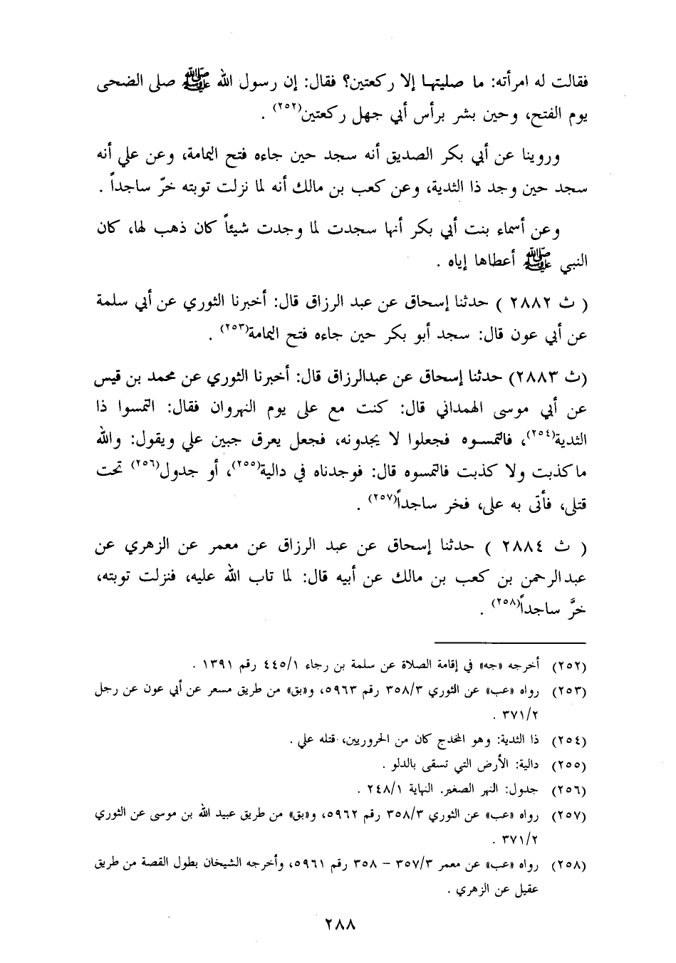 2884 - حَدَّثَنَا إِسْحَاقُ، عَنْ عَبْدِ الرَّزَّاقِ، عَنْ مَعْمَرٍ، عَنِ الزُّهْرِيِّ، عَنْ عَبْدِ الرَّحْمَنِ بْنِ كَعْبِ بْنِ مَالِكٍ، عَنْ أَبِيهِ، قَالَ: لَمَّا تَابَ اللهُ عَلَيْهِ، فَنَزَلَتْ تَوْبَتُهُ، خَرَّ سَاجِدًا "